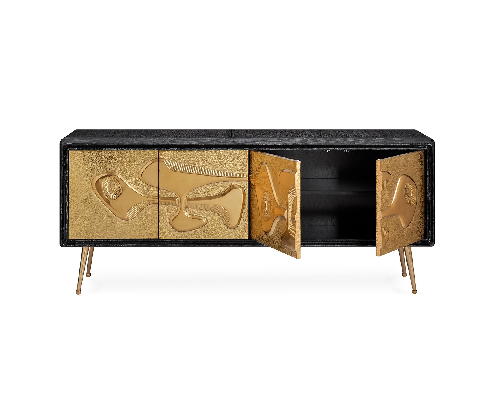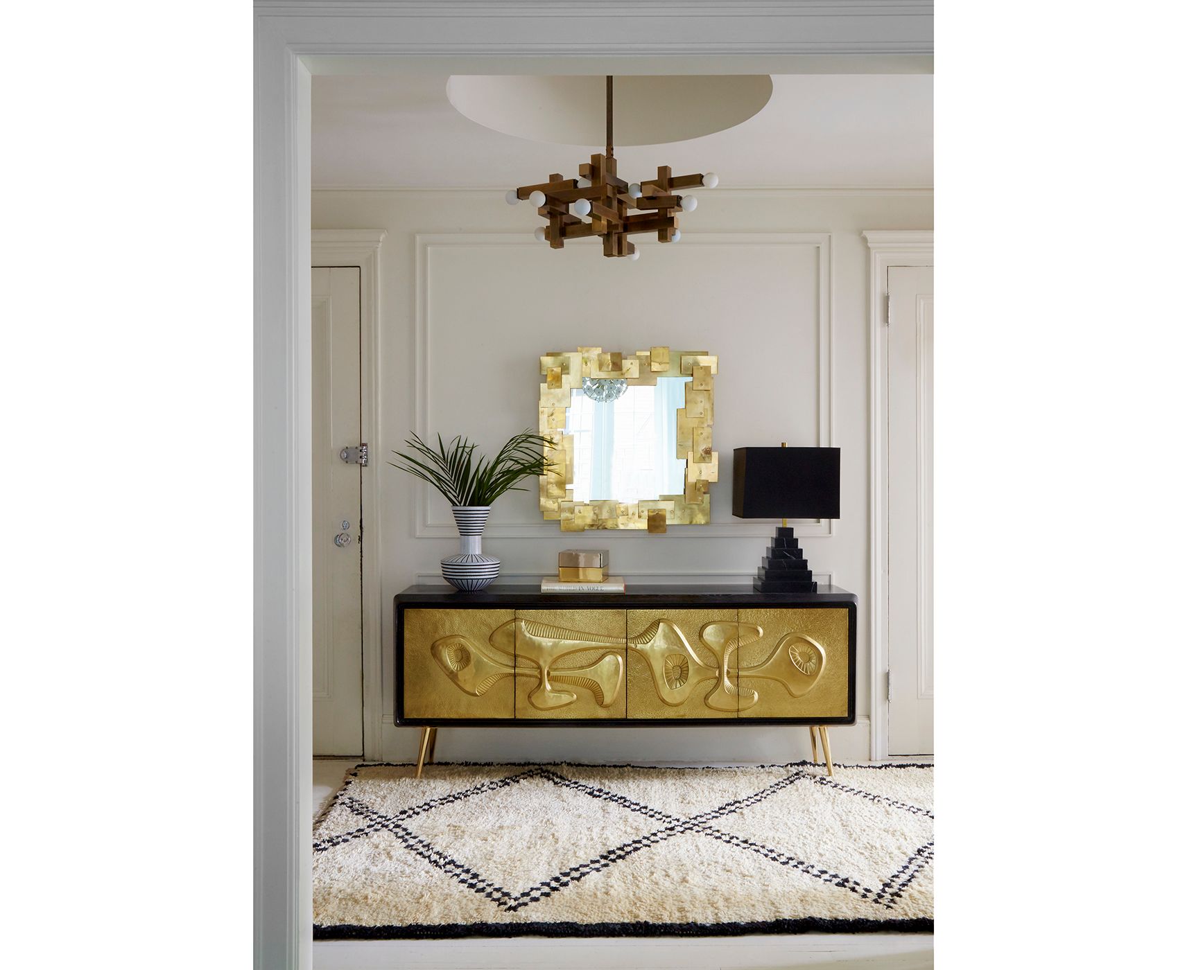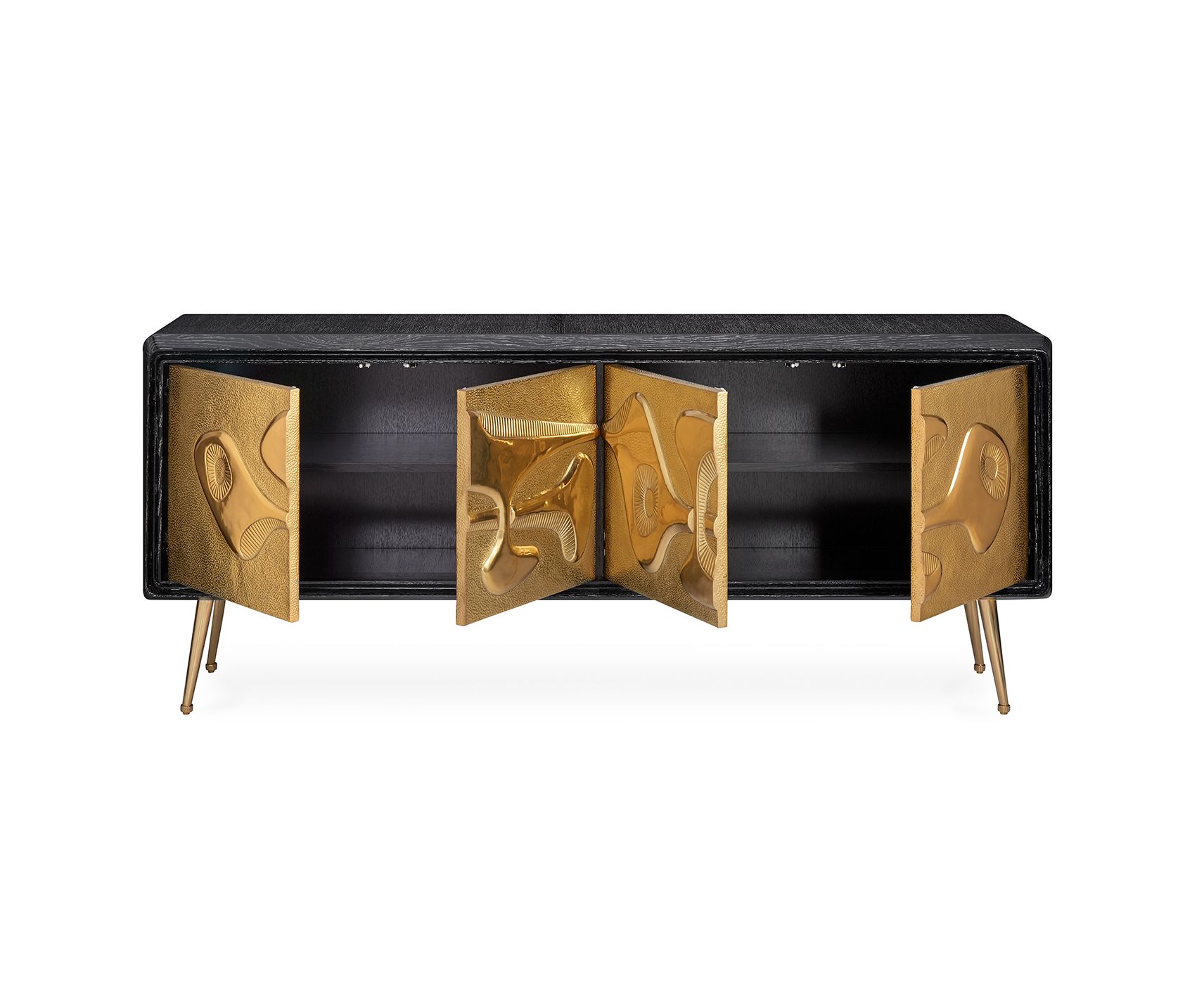 Reform Credenza вдохновлена брутальной архитектурой модернистских храмов и церквей от Le Corbusier's Ronchamp до Miami's Temple Israel и the Cathedral of Brasìlia. Фирменный рисунок возник в виде рельефной текстуры, созданной в гончарной мастерской Jonathan Adler в Сохо. Дизайн высечен на деревянных дверях, а затем обшит одним листом латуни, который выкован вручную и отполирован до совершенства. Трудоемкий процесс занимает от 8 до 12 часов на дверь. Деревянный шкаф сделан из дуба, который был эбонизирован и выровнен и установлен на твердых латунных ножках. Божественные детали - легкий скос на прочном дубовом кожухе, изящный поплавок между дубом и медным шкафом, а также потрясающие закрывающие механизмы с защелкой выводят Reform Credenza на небывалую высоту мастерства кутюрье.