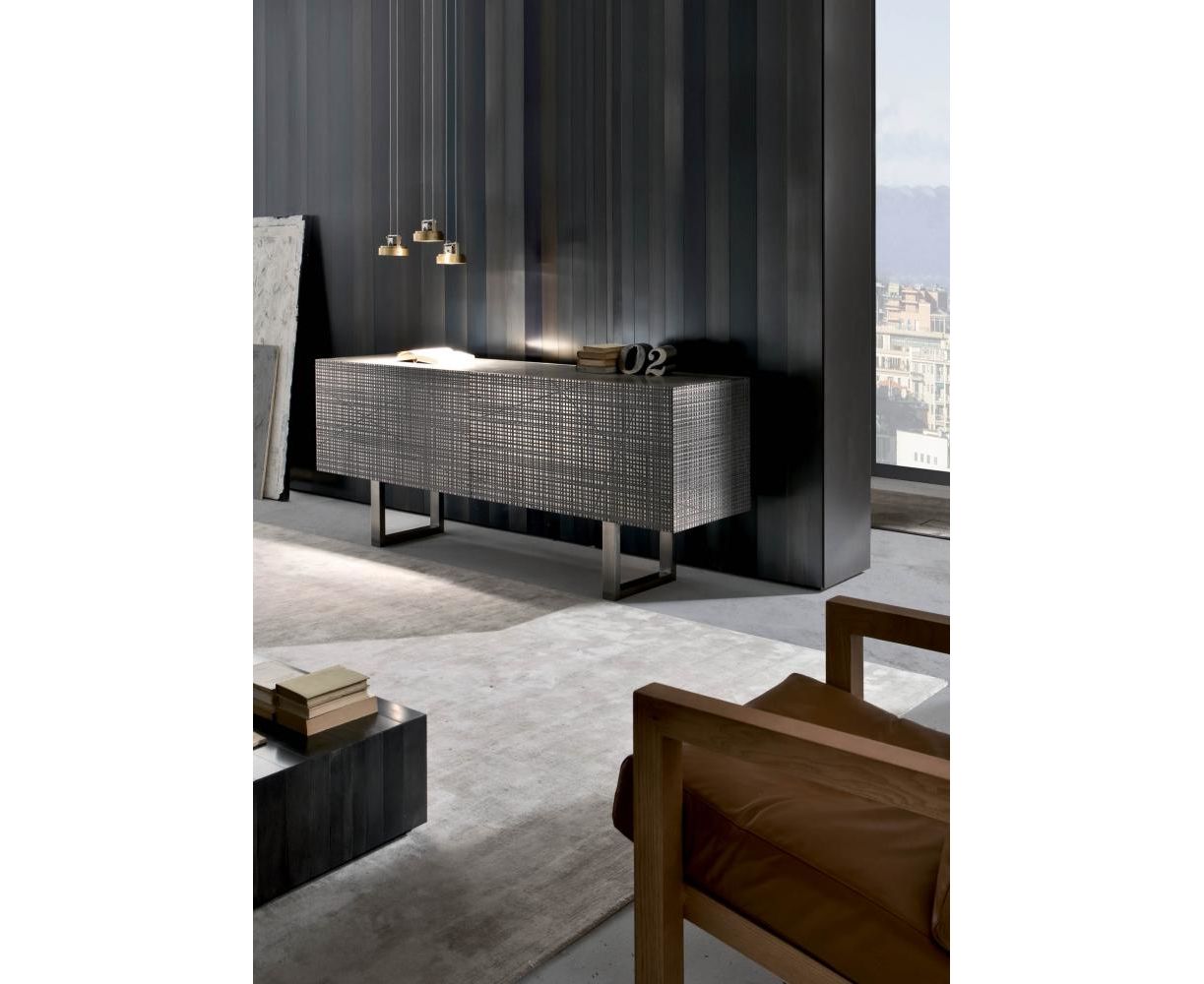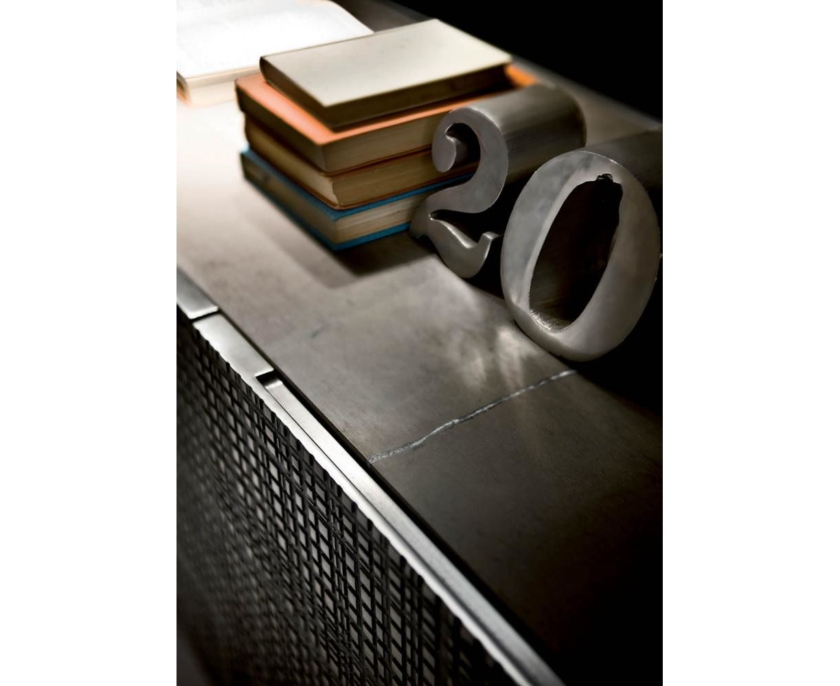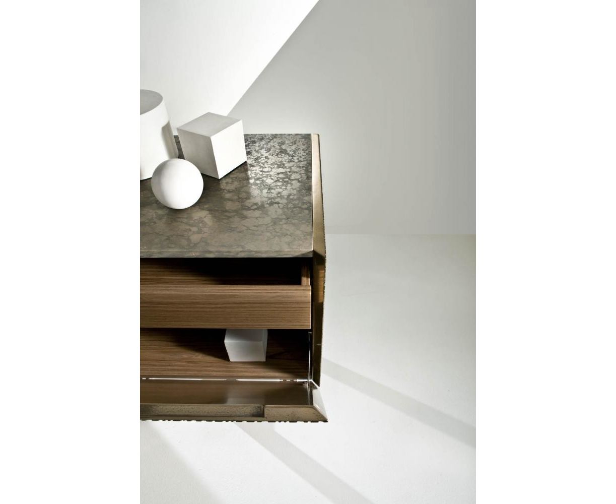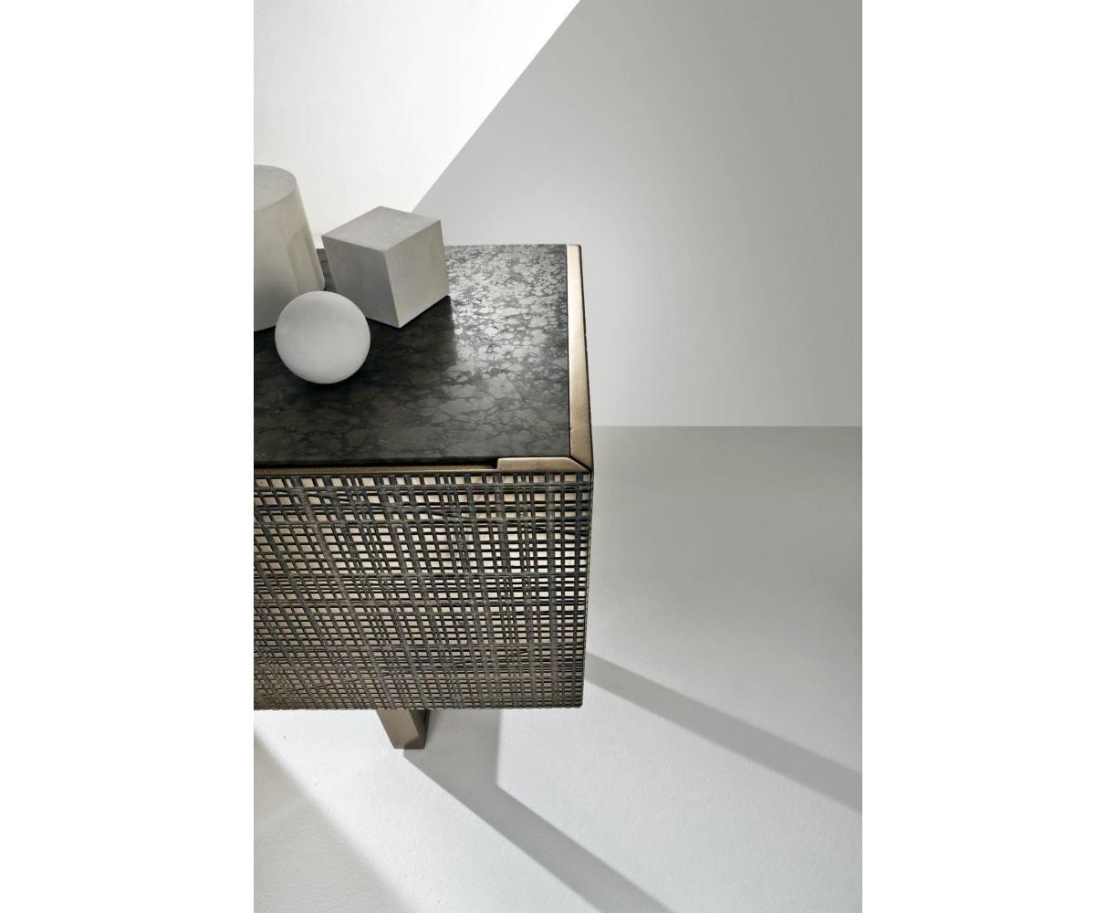 Тумба из дерева с боковинами и дверцами, украшенными насечками, с отделкой «Metallo Liquido» и верхней панелью из дерева или из мрамора. Оснащена внутри двумя полностью выдвигаемыми ящиками. Доступна с распашными или откидными дверцами, на ножках из дерева или в настенном варианте.