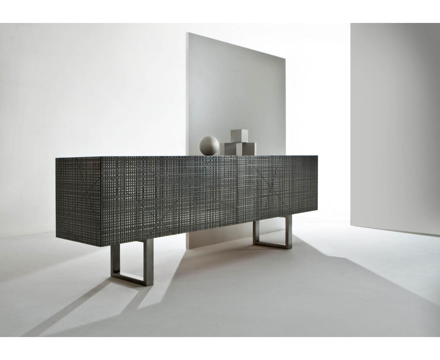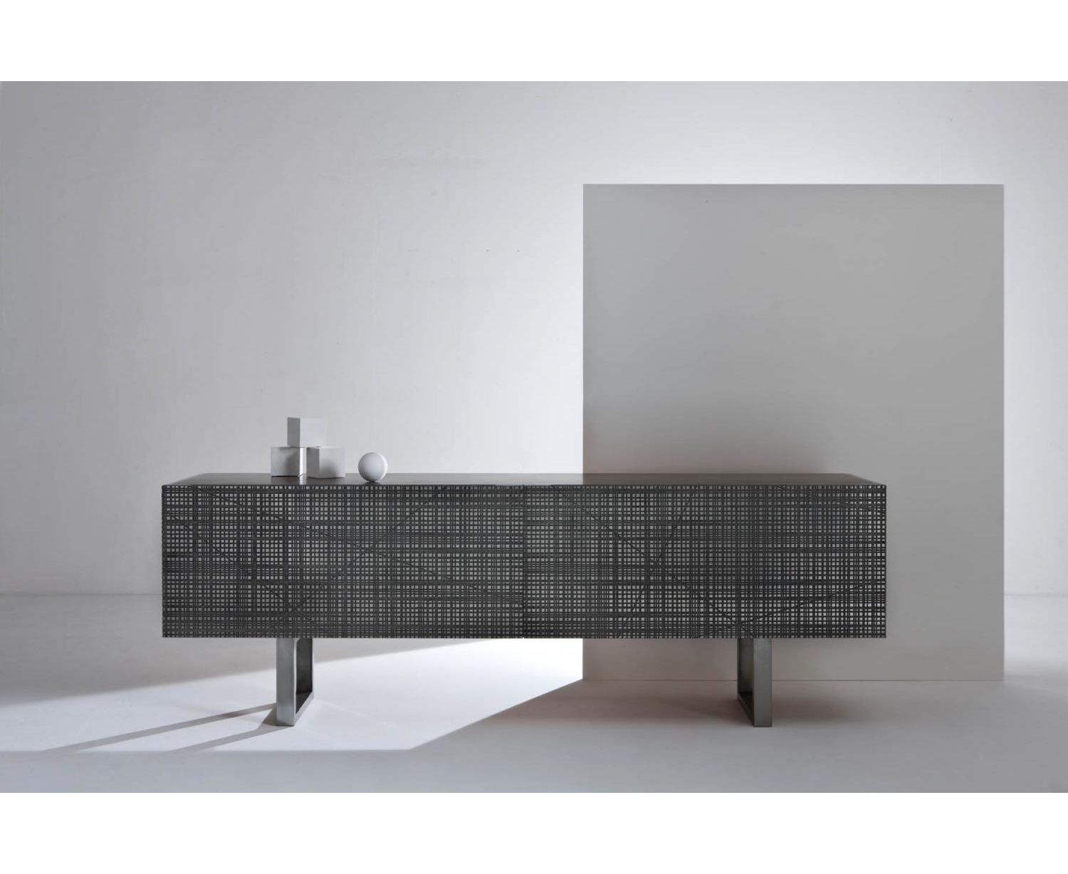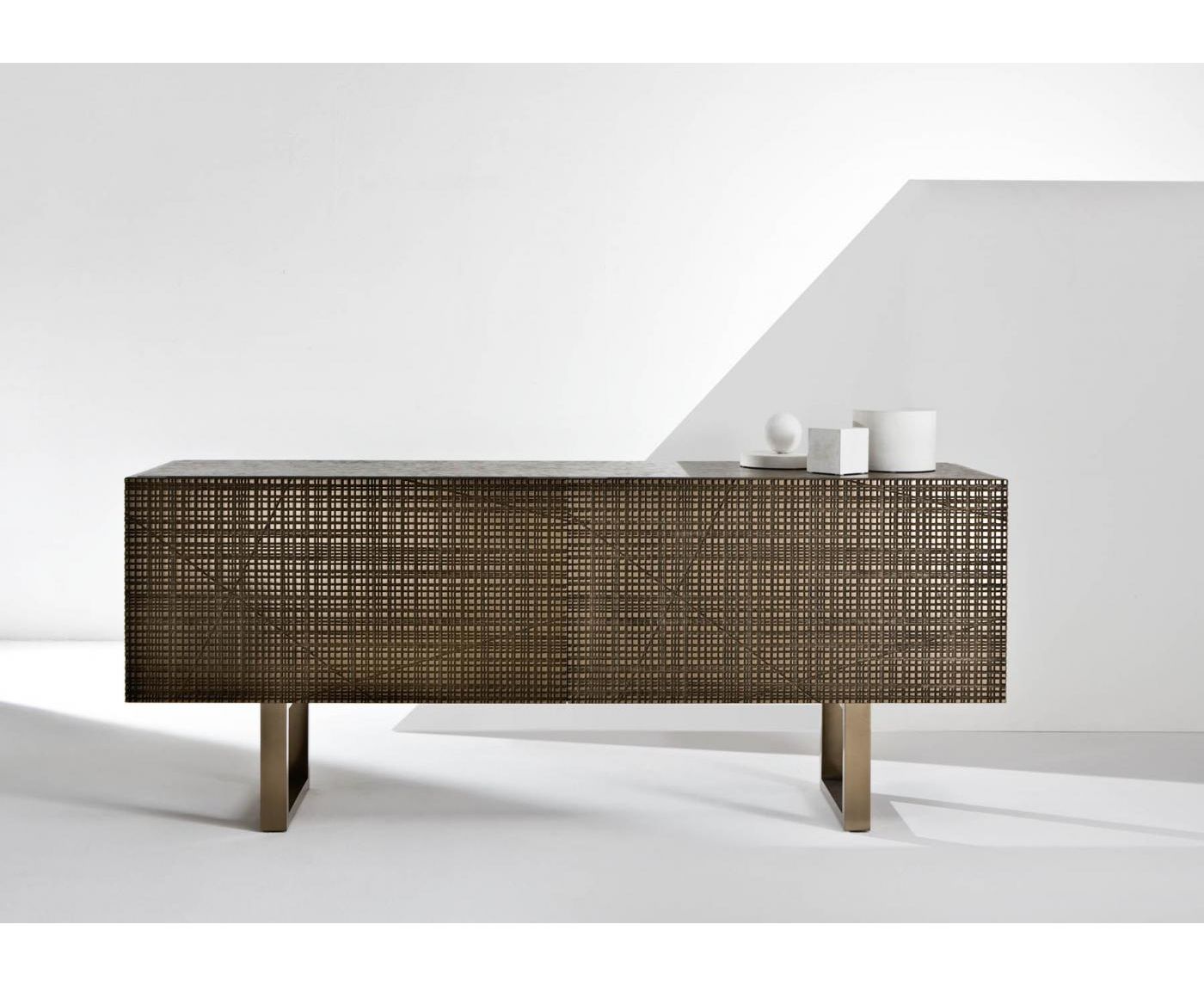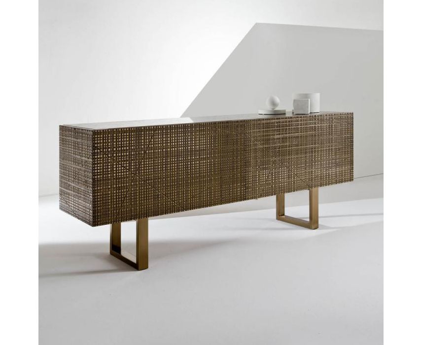 Тумба из дерева с боковинами и дверцами, украшенными насечками, с отделкой «Metallo Liquido» и верхней панелью из дерева или из мрамора. Оснащена внутри двумя полностью выдвигаемыми ящиками. Доступна с распашными или откидными дверцами, на ножках из дерева или в настенном варианте.