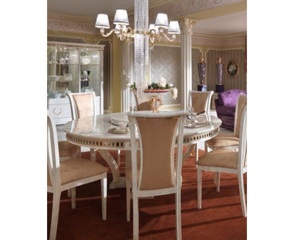 Обеденный стол из коллекции Arcade Plus Collection выполнен в классическом стиле. Простой и скромный дизайн отражает мастерство изготовления. Структура сделана из массива дерева. Модели декорированы вручную. Каркас и топ в полиэстровой глянцевой отделке тёмно-коричневого или белого цвета с узором древесного корня или эрабле и коричневого с эффектом тампонато. В коллекцию входят модели с круглой и прямоугольной столешницей. Боковые опоры - ножки подкреплены изогнутыми дополнительными опорами. Столы украшены узорами и вставками, окрашенными в золотой цвет.