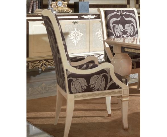 Стул из коллекции Hermitage Collection выполнен в классическом стиле, отражая мастерство изготовления и высокое качество материалов. В коллекцию входят стулья с или без подлокотников. Cтруктура сделана из массива дерева. Модели декорированы вручную. Деревянные части каркаса в полиэстровой глянцевой отделке бежевого цвета с узором древесного корня. Высокая мягкая спинка слегка отклонена назад. Мягкое сиденье. Резные ножки украшены узорами золотого цвета. Модели с подлокотниками имеют мягкие вставки на них.