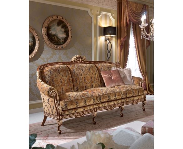 Коллекция трехместных диванов и кресел Iago выполнена в классическом стиле. Модели богато украшены декоративными элементами и произведены только из высококачественных материалов. Каркас изготовлен из древесины. Высокая мягкая спинка дивана символически поделена на три части. По верху проходит деревянный резной элемент, который в центре украшен крупной резной "короной". Мягкие подлокотники - завитки. Диван стоит на шести ножках кабриоли: четыре спереди и две сзади. Подушки сиденья не закреплены на каркасе. Видимые части деревянного каркаса в полиэстровой глянцевой отделке цвета древесного корня с эффектом материко.