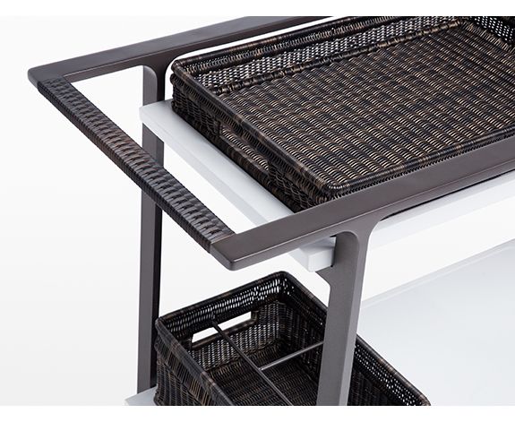 К вашим услугам. Эта барная тележка для уличного применения уравновешивает изысканную линейную раму с прочностью, необходимой для развлечений на открытом воздухе. Тележка для баров Omura установлена на четырех полностью поворачивающихся наружных роликах, что обеспечивает максимальную маневренность и возможность фиксации на месте. Тележка поставляется с двумя корзинами для хранения снаряжения хозяина, а также ткаными деталями на задней ручке.