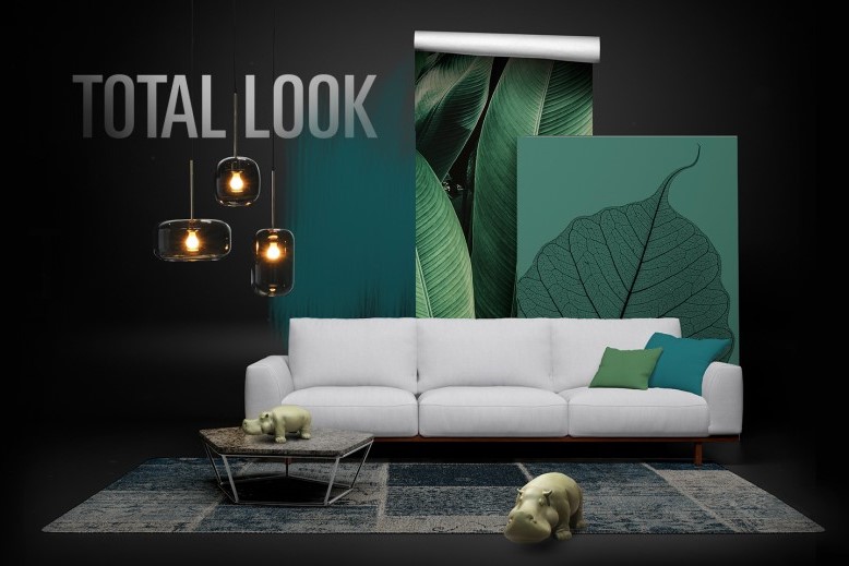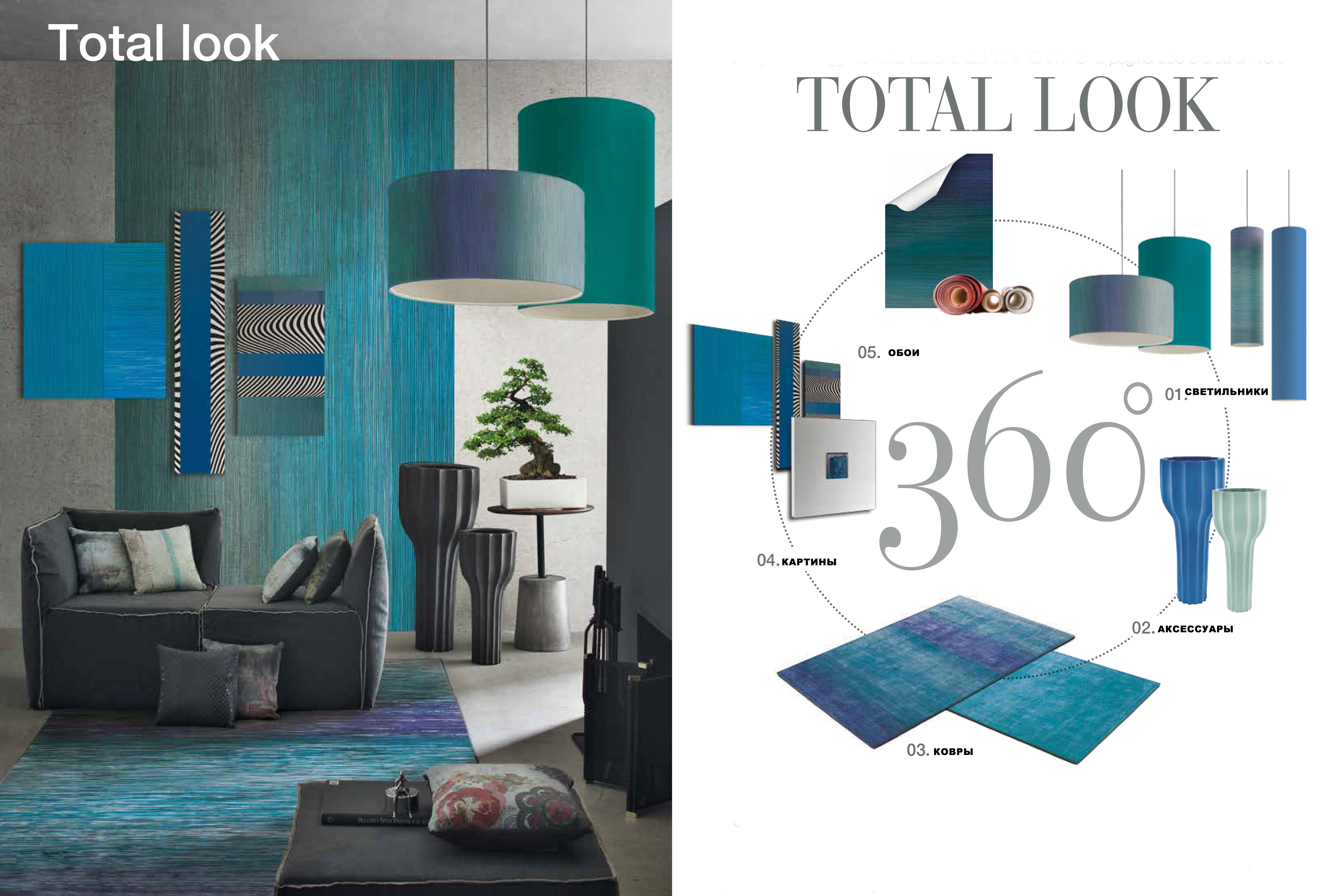 Total Look – это оформление пространства в едином стиле, все продумано до мелочей. Стиль создается с любым материалом: стеклом, керамикой, деревом, коврами, лампами, картинами, металлами, все строго выполнено в Италии или Европе под прямым контролем Adriani & Rossi. Картина сочетается с обоями, ковер повторяет рисунок картины, вазы гармонируют со светильниками, а мебель в идентичных тонах, что и обои... и так на 360°. В этом плане они отлично дополняют свои услуги визуализацией на 360°, от начальной проекции до собственно коммуникационных печатных материалов или от фотографии до 3D-проекта.