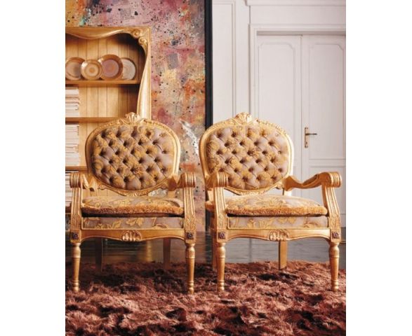 Кресло Angelica/Capitonne 0975 выполнено в классическом стиле на каркасе изготовленном из массива бука. Фигурные резные ножки с резными элементами, окрашенными в золотой цвет. Невысокая мягкая спинка - медальон со стежкой капитоне обрамлена деревянной рамой с резными декоративными элементами, окрашенными в золотой цвет. Мягкая подушка сиденья украшена бахромой. В качестве обивки использована ткань с рисунком. Подлокотники - завитки с мягкими вставками.