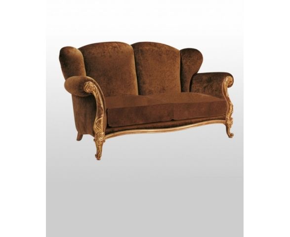 Диван Botero 1220 выполнен в классическом стиле на каркасе, изготовленном из массива липы. Утонченные ножки кабриоли окрашены в благородный золотой цвет. Высокая мягкая спинка условно разделена посередине и украшена ушками. Сиденье состоит из двух подушек, незакрепленных на каркасе. В качестве обивки использована ткань с тонким рисунком. Подлокотники - завитки украшены фигурными деревянными элементами золотого цвета.