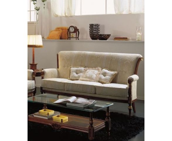 Диван Demetra 0890 выполнен в классическом стиле на каркасе, изготовленном из массива бука. Утонченные фигурные ножки окрашены в темный цвет. Высокая мягкая спинка закруглена сверху и дополнена деревянными элементами. Мягкое сиденье состоит из трех подушек. В качестве обивки использована ткань с тонким набивным рисунком. Подлокотники - завитки с деревянными элементами.