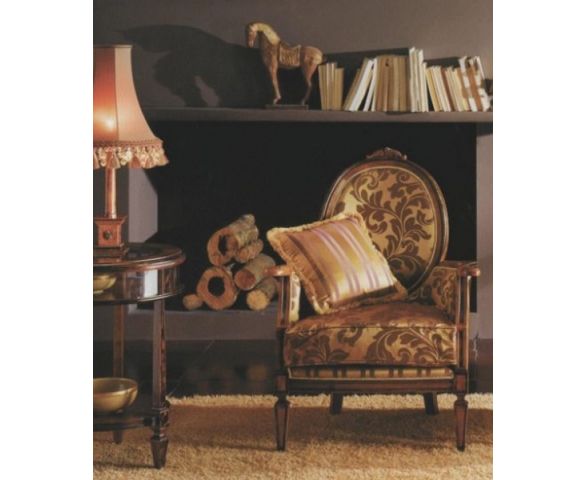 Кресло Giulietta/IM 2056 выполнено в классическом стиле на каркасе, изготовленном из массива бука. Резные ножки окрашены в темный цвет. Невысокая мягкая спинка - медальон обрамлена деревянной рамой с аккуратным, едва заметным резным орнаментом. Мягкая подушка сиденья незакреплена на каркасе. В качестве обивки использована ткань с рисунком. Подлокотники без мягких вставок.