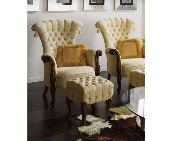 Кресло Gregorio 1196 выполнено в классическом стиле на каркасе, изготовленном из массива бука. Утонченные ножки кабриоли, окрашены в светлый цвет. Высокая мягкая закругленная спинка украшена декоративной стежкой капитоне с пуговицами. Сиденье состоит из одной подушки. В качестве обивки использована ткань. Подлокотники - завитки украшены фигурными деревянными элементами светлого цвета.