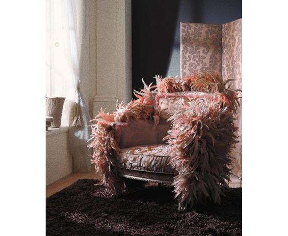 Кресло Lolita 1155 выполнено в классическом стиле на каркасе, изготовленном из массива бука. Утонченные ножки кабриоли. Кресло выполнено в тканевой обивке с тонким рисунком. Мягкая невысокая спинка. Подлокотники без мягких вставок. Каркас кресла украшен непривычным для мебели способом, в качестве декоративного элемента использованы перья в тон общей обивке.