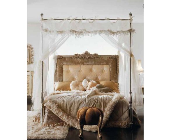 Двуспальная кровать Proposta 02 с балдахином заключает в себе классические традиции, воплощенные с помощью высококачественных натуральных материалов. Каркас изготовлен из массива древесины. Короткие фигурные ножки, окрашены в серебряный цвет. Высокое прямоугольное изголовье украшено стежкой капитоне и деревянной рамой с резными цветочными орнаментами, окрашенными в цвет обивки. Кровать выполнена в текстильной обивке.