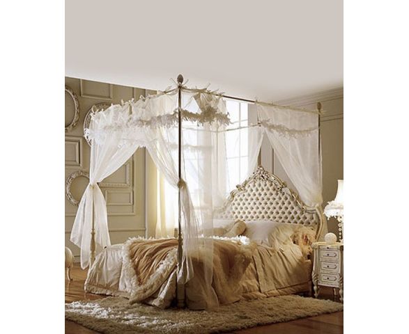 Двуспальная кровать Proposta 25 с балдахином выполнена в классическом стиле на деревянном каркасе. Короткие фигурные ножки, окрашены в светлый цвет. Королевское фигурное мягкое изголовье украшено стежкой капитоне и резными цветочными орнаментами и бантиками. В двуспальной кровати этой модели все сбалансировано и гармонизировано.
