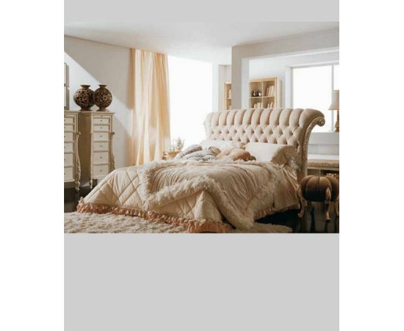 Двуспальная кровать Proposta 27 выполнена в классическом стиле на деревянном каркасе. Короткие фигурные ножки, окрашены в светлый цвет. Королевское мягкое изголовье закругляется сверху, по бокам его украшают деревянные вставки с цветочным орнаментом, выделенным цветом. Все изголовье украшено стежкой капитоне с маленькими пуговицами. В качестве обивки изголовья - текстиль.