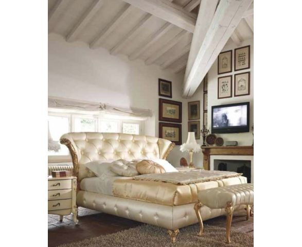 Двуспальная кровать Proposta 35 выполнена в классическом стиле на каркасе, изготовленном из массива бука. Короткие фигурные резные ножки, окрашены в золотой цвет. Невысокое мягкое изголовье с ушками украшено деревянными резными элементами, окрашенными в золотой цвет и декорировано стежкой капитоне с пуговицами. В качестве обивки использован текстиль.