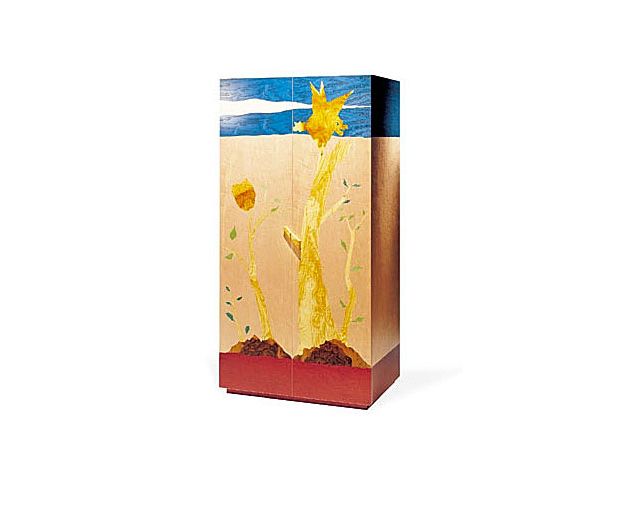Придать необычности и оригинальности простым предметам, вот о чем думали дизайнеры, когда создавали эту модель. Платяной шкаф из древесины. Внутри выдвижные ящики и штанга для одежды. Шкаф декорирован интарсией из разноцветного шпона.