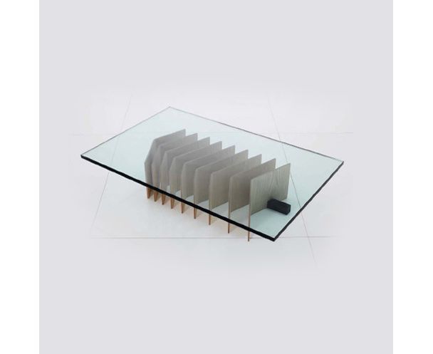 Оригинальный столик. Прямоугольный топ выполнен из прозрачного закаленного стекла и лежит на тонких форменых панелях из древесины. Кажется, что все в этой модели случайно, это придает ей легкость и непосредственность.