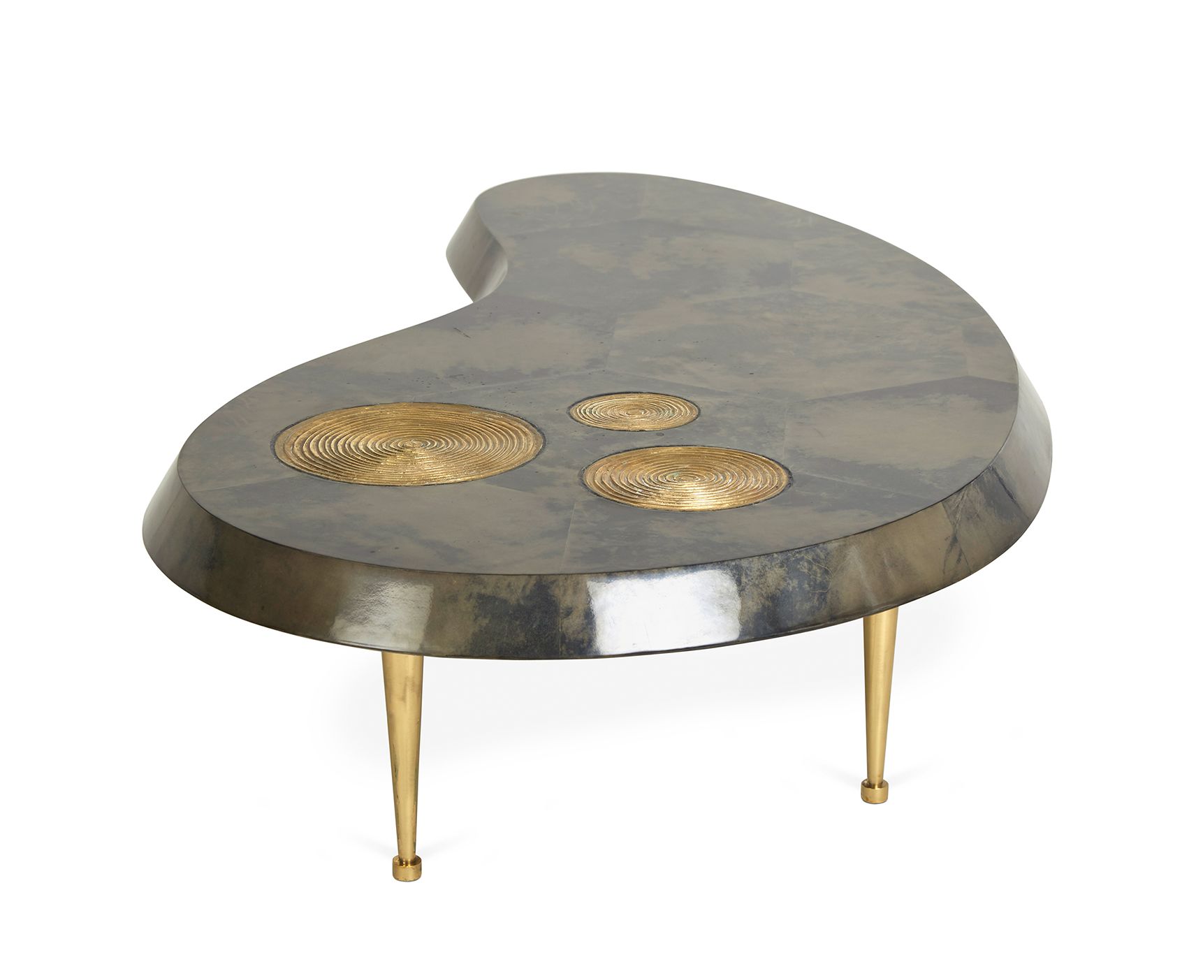 Органическая форма почки, покрытая кусочками лакированной и окрашенной чернилами древесного угля и украшенная тремя вставными медными медальонами из литого песка. Приятно извилистая форма завершена удивительными коническими краями и опирается на гибкие полированные латунные ножки. Легкий и длинный, это идеальное дополнение к величественному дивану.