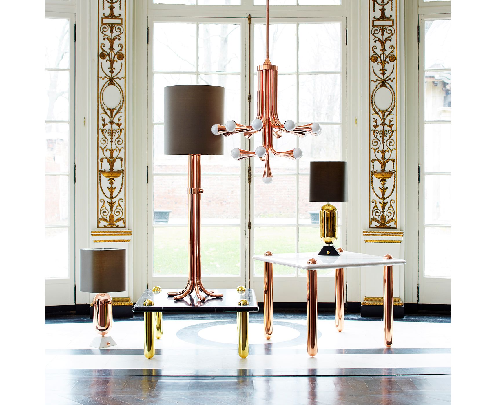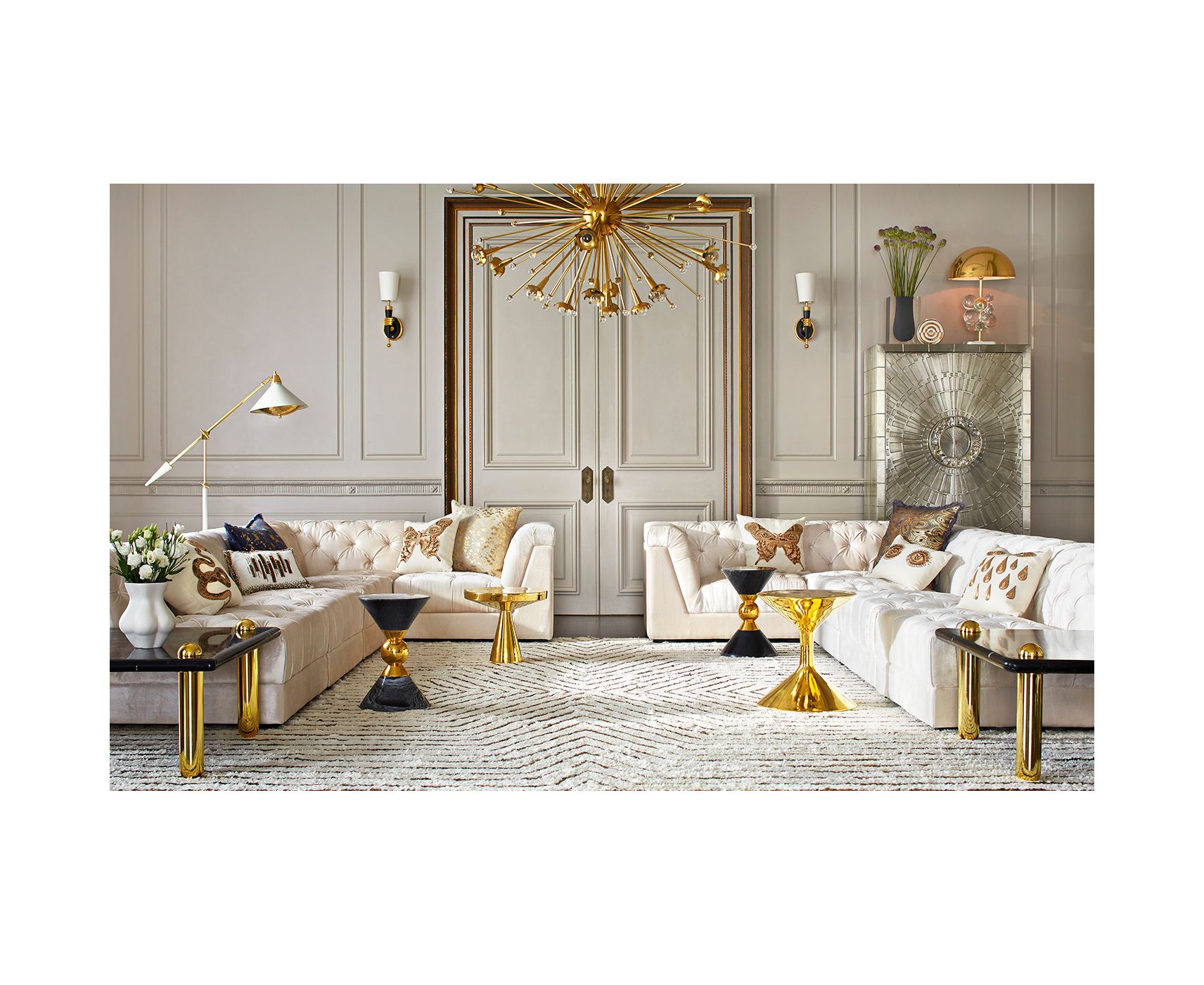 Беззастенчиво гламурно и глянцево. Ножки в форме ромба являются краеугольным камнем коллекции - каждая из них изготовлена из розового золота или полированной латуни и разделена пополам кусочком глянцевого мрамора Marquina (тип, предпочитаемый древними римлянами). Fab сам по себе, как журнальный столик, или идеально подходит в качестве торцевого стола с Ultra Sectional.