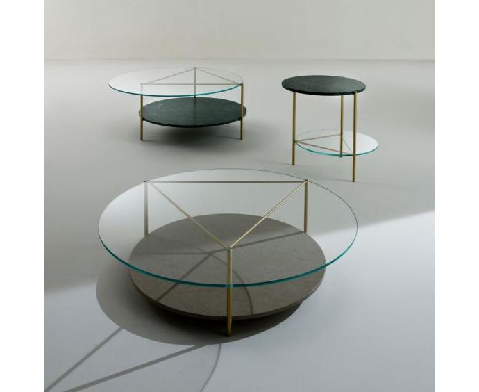 Комплект из 3-х круглых столиков, дополняющих друг друга по высоте, с основанием из латуни и тяжелыми столешницами из мрамора и хрустального стекла. Треугольная рамка из латуни между двумя столешницами из мрамора и хрустального стекла: простые геометрические формы, соединенные в трехмерном пространстве, определяют уникальность столиков Echo. В деталях и обработке выявляется современное ремесленное мастерство. Брашированная латунь, ценные виды мрамора и очень светлое хрустальное стекло представляют собой предлагаемые виды отделки. Благодаря гармонии между основательностью и эффектом геометрических форм, эти столики являются идеальным решением для изысканных интерьеров.