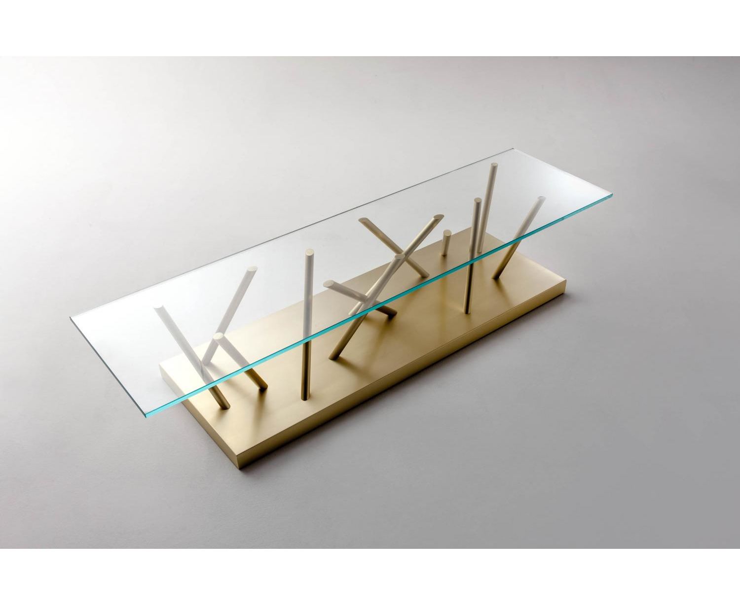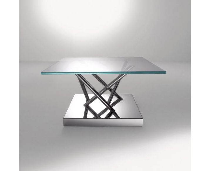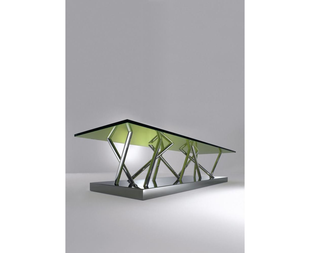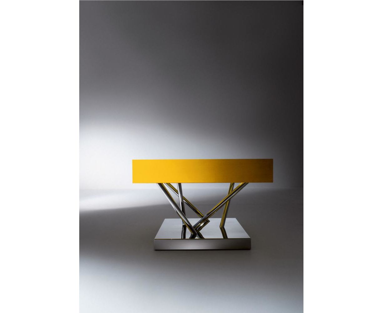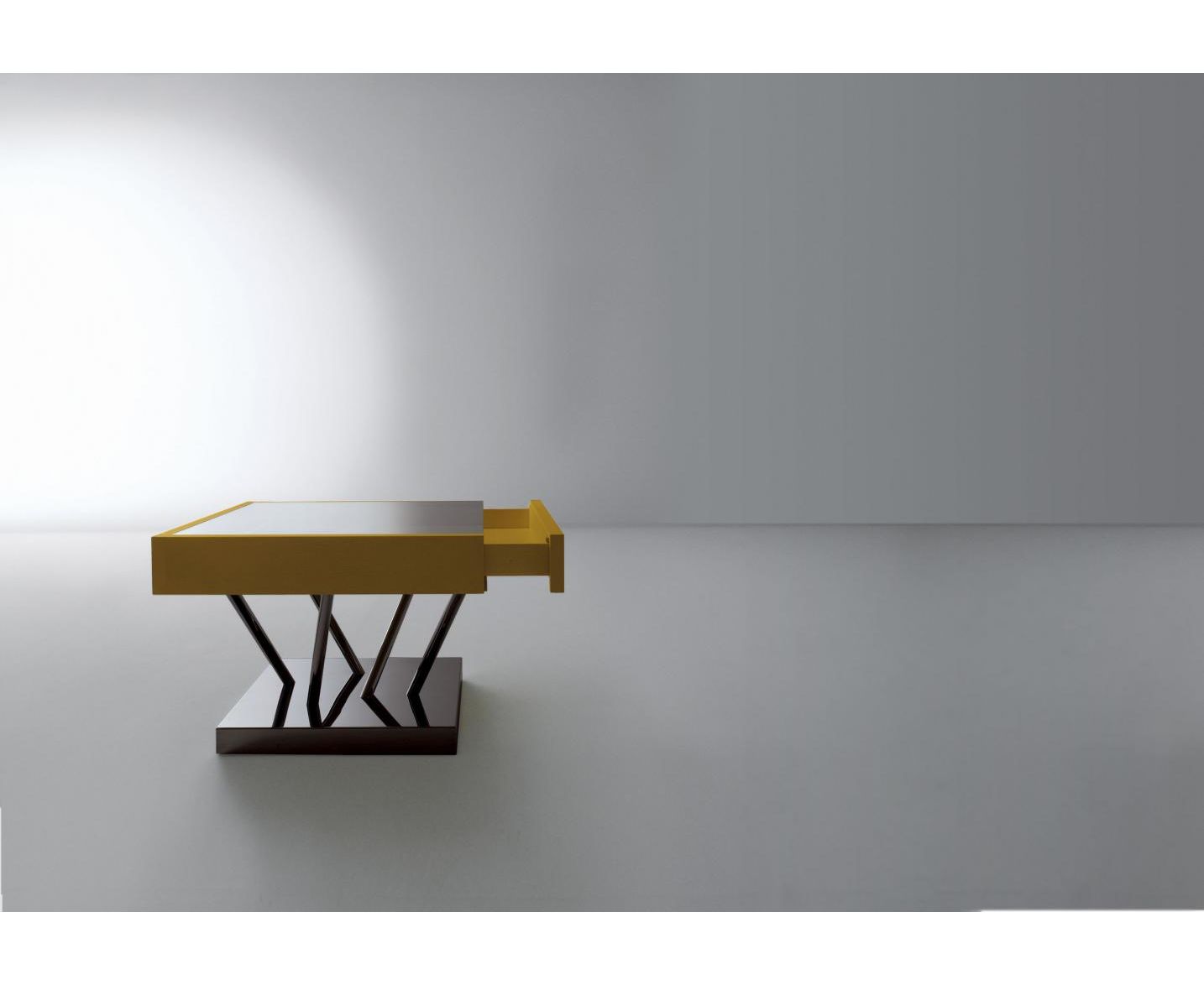 Низкие столики с основанием из блестящей стали и столешницей из желтого двойного или очень прозрачного стекла. SA01, 04 и 05 – это журнальные столики, разработанные студией Sottsass Associati, которые создают игру света, благодаря умелому использованию и творческой комбинации стекла и стали. Это не просто функциональные столики, но, скорее, элементы дизайна, предназначенные для изысканных пространств. Столик SA 04 комбинирует своеобразное основание из стали с ящиком из клена, окрашенным анилиновой краской в желтый цвет.
