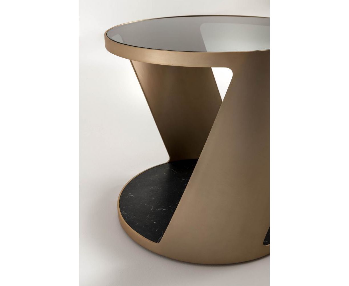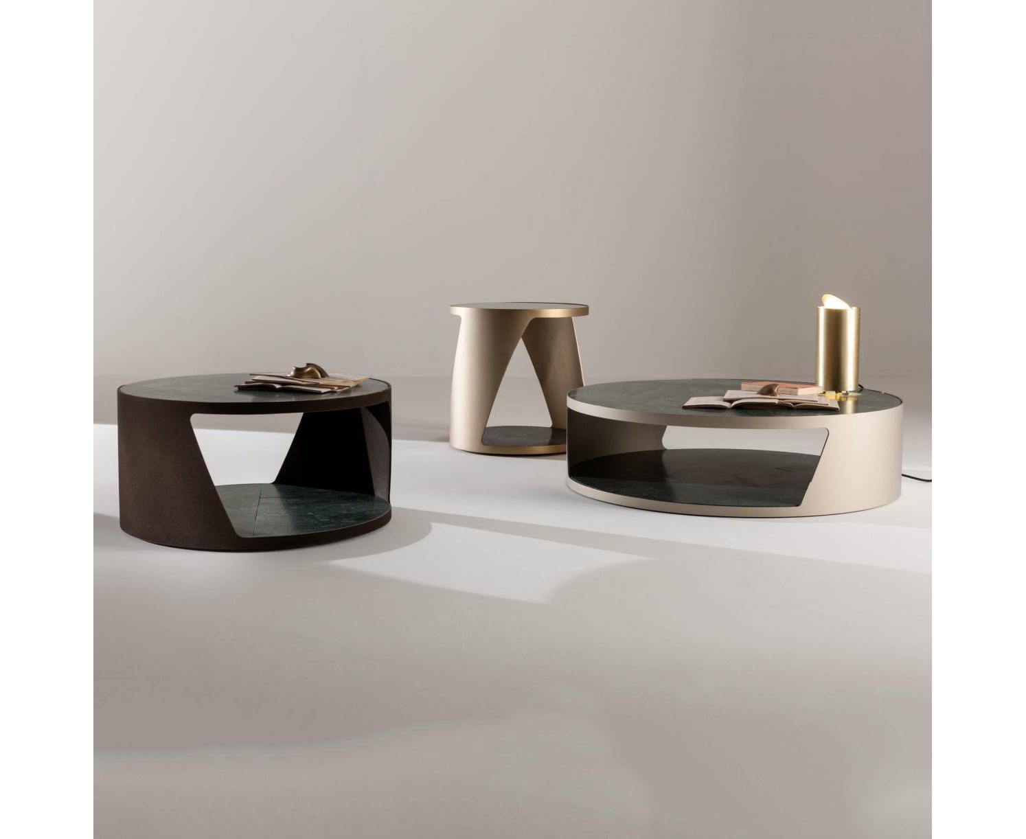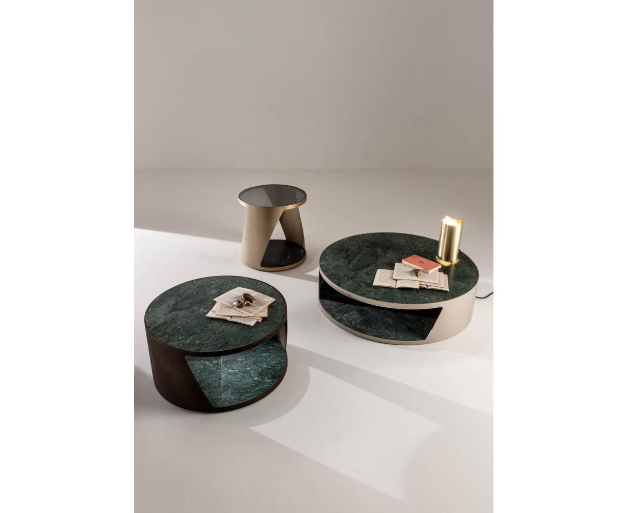 Комплект круглых столиков с лакированным металлическим основанием и столешниц на выбор из мрамора или стекла, предложенных в коллекции. Проект комплекта столиков, сочетающихся между собой по размерам и отделке, основан на поиске удобных и простых форм. Смещенные столешницы и необычное сочетание материалов и отделки создают привлекающий внимание и элегантный современный дизайн. Столики могут быть размещены как в домашних, так и в офисных и гостиничных интерьерах, а также превращаться в элегантные прикроватные тумбочки в спальной зоне.