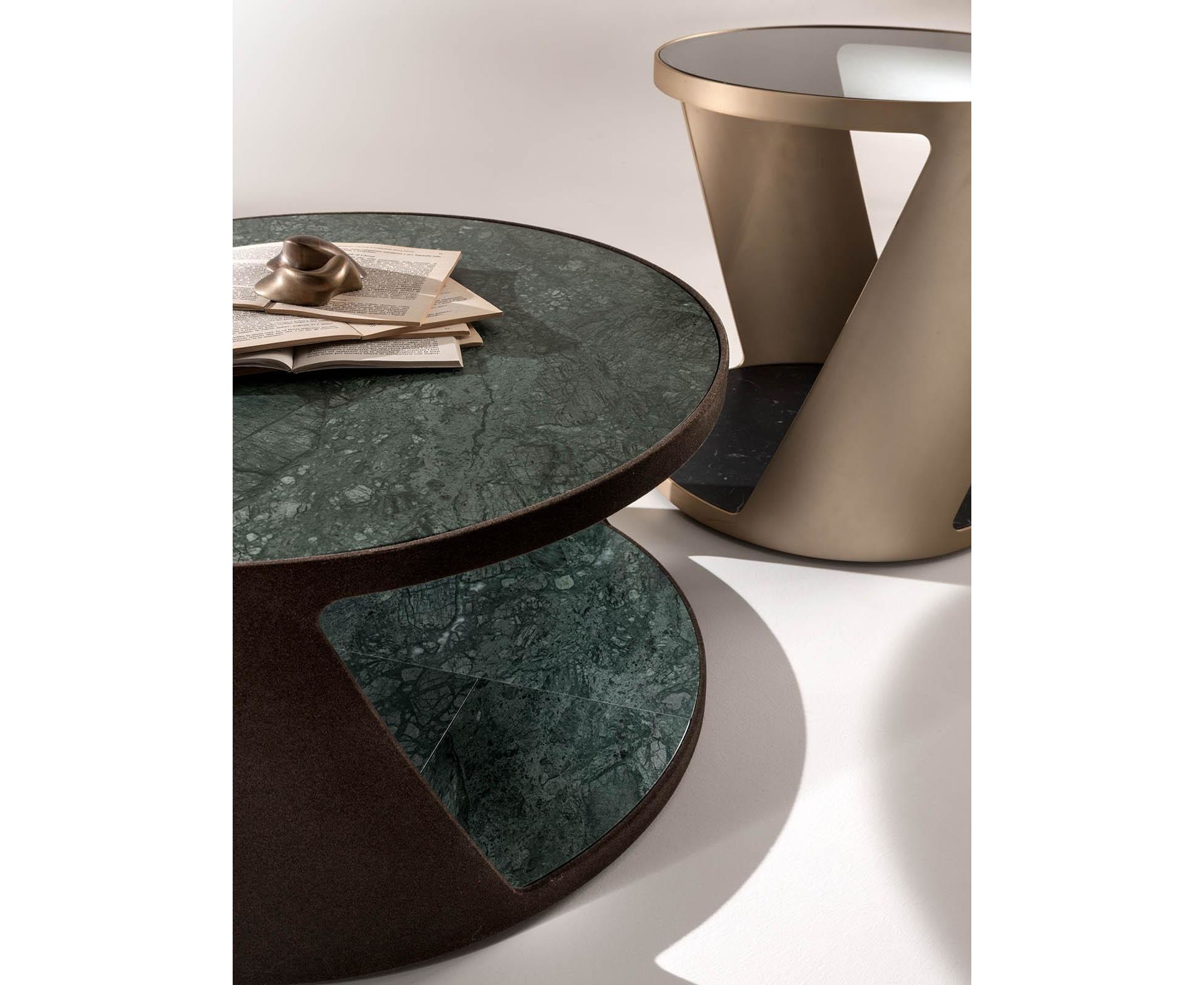 Проект «Shadow» включает в себя три небольших столика с различными размерами и высотой, которые можно комбинировать между собой благодаря их естественной элегантности. Особым лакированным каркасом столика создается игра «пустот и заполненностей» с двумя столешницами, украшенными мрамором «Verde Guatemala».