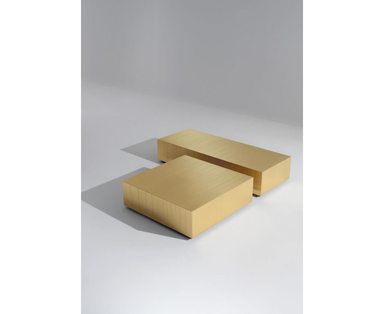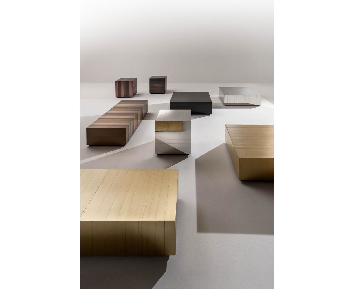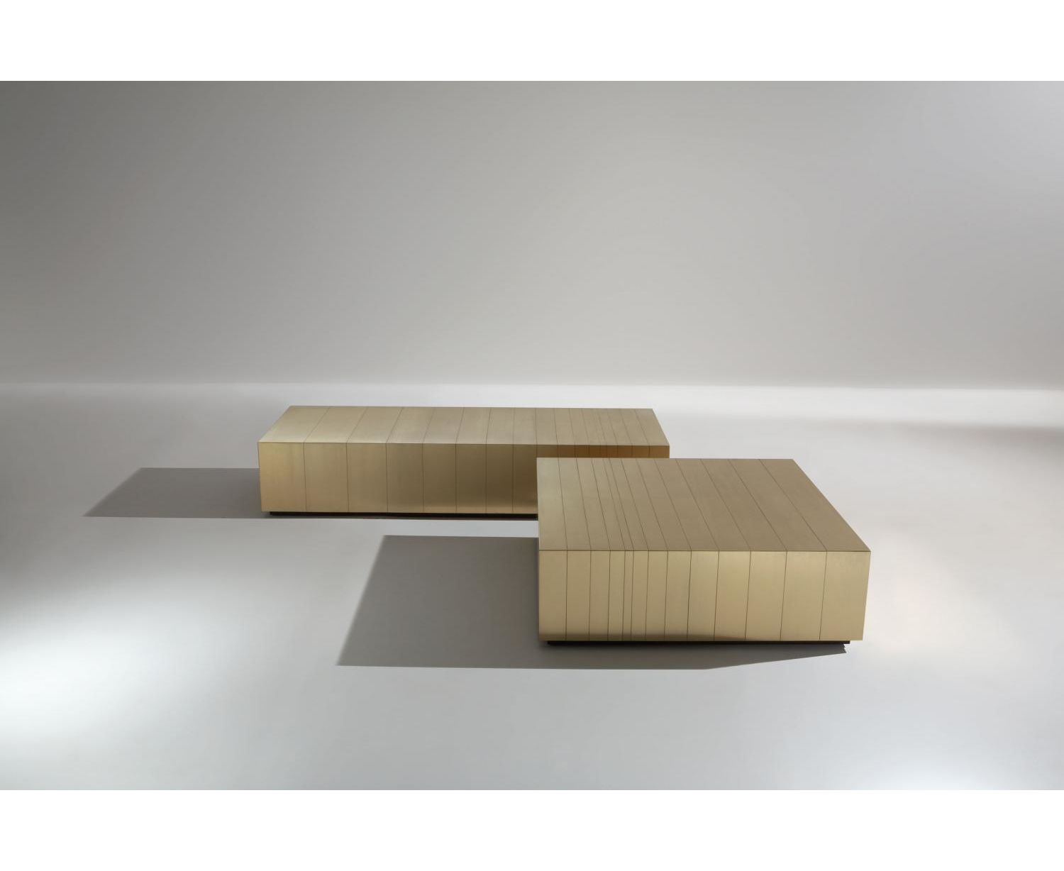 Комплект низких столиков Stars, полностью покрытых металлом: латунью, медью, сталью или железом. Эти столики, доступные в квадратной, прямоугольной большого и маленького размеров и кубической форме, являются результатом, отвечающим необходимости создания современного изделия.