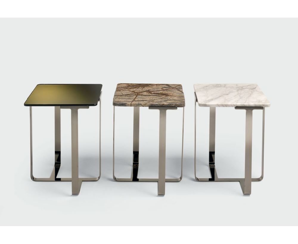 Прямоугольные и квадратные столы с черным стальным хромированным каркасом смогут быть четырех разных размеров и различаться также по высоте. Наклоненные столешницы представлены в варианте из стекла, где низ окрашен в стандартные цвета RAL, имеющиеся в коллекции, кроме того, добавлена новая версия в ярком золотисто-бронзовом тоне; в варианте из мрамора - стандартный тип, а также есть новая версия в буро-коричневом цвете и с мягкой или шорно-седельной кожей.