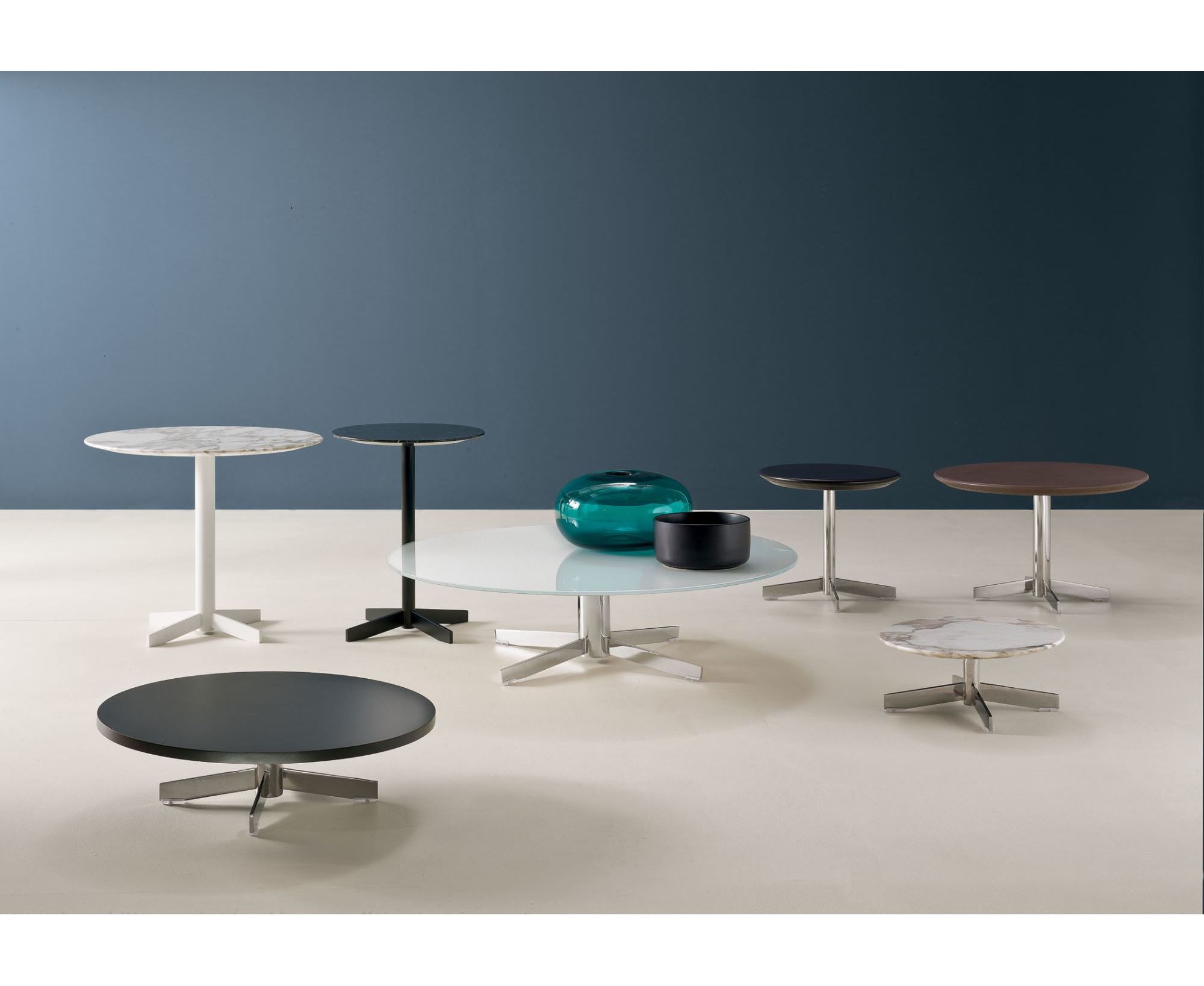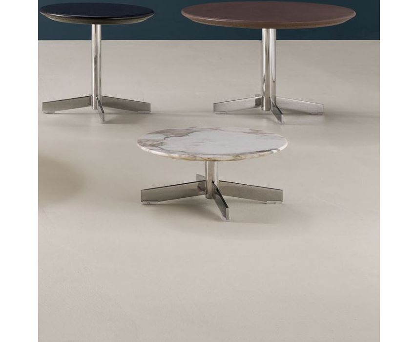 Журнальные столики с круглой столешницей разных диаметров и с 4 различными высотами. У всех круглое 4-лучевое трубчатое основание из хромированной стали; столешницы могут иметь разные отделки: мрамор Калакатта Оро, черный мрамор Маркуина, белый мрамор Венато Джойя, черную облагороженную меламиновую панель, обшиты шорно-седельной кожей или мягкой кожей, могут быть покрыты стеклом, окрашенным с обратной стороны в белый цвет, быть стальными полированными, из ДСП с белым или черным ламинатом и черной блестящей кромкой.