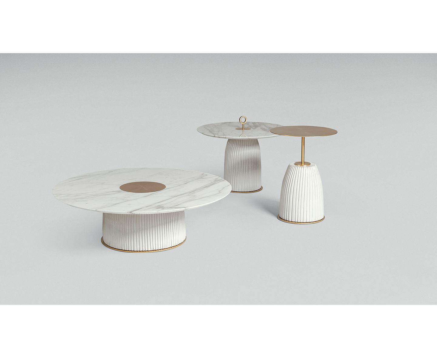 Скульптурные журнальные столики, в которых по разным формам сочетаются благородные материалы, такие как мрамор, металлическая гальваническая отделка и керамика ручной работы, тонко обработанные вручную во Вьетри.