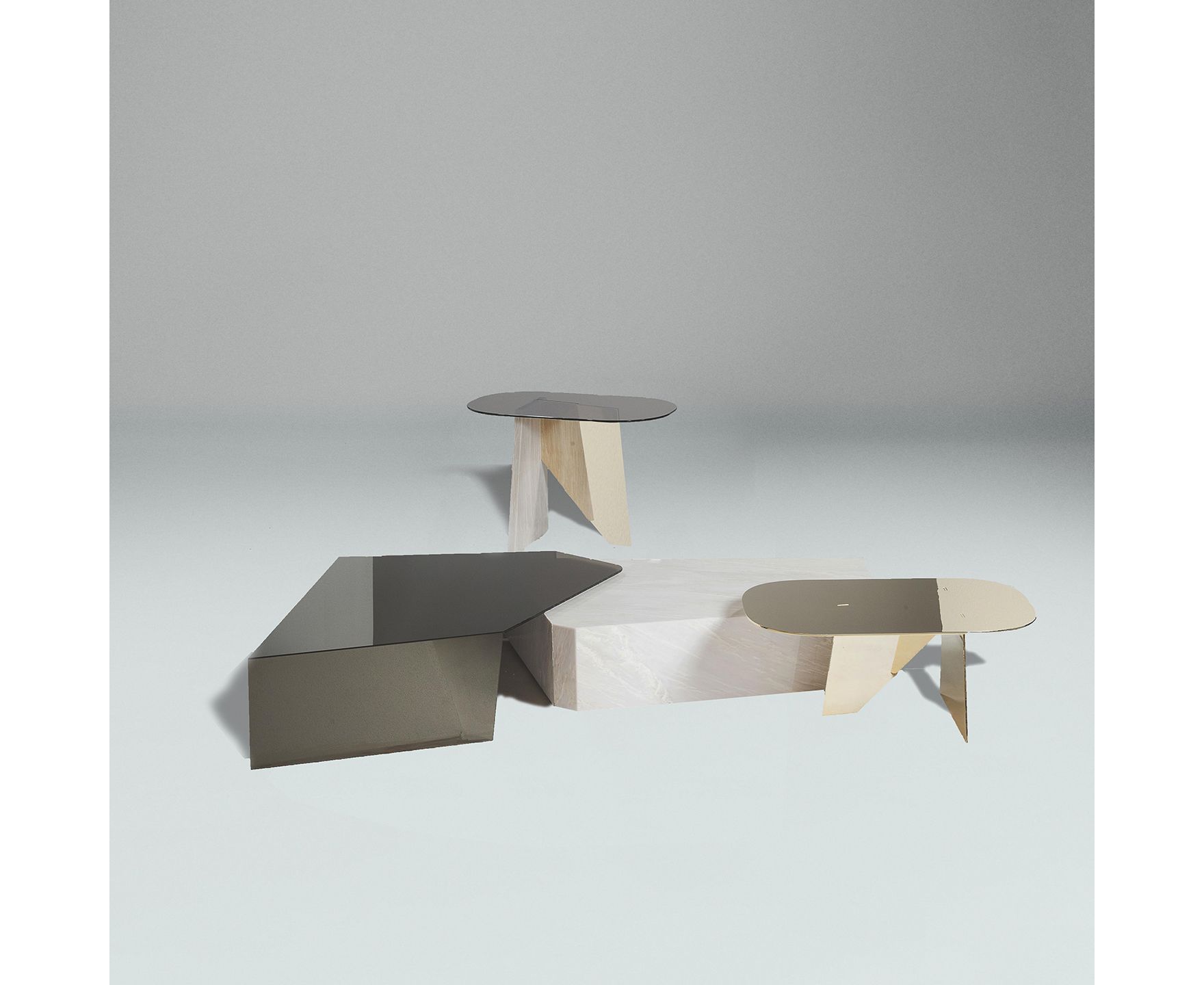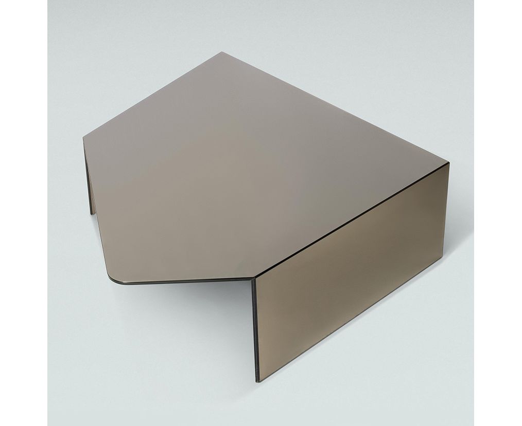 IMPERFECT GLASS - Журнальный столик, изготовленный из светоотражающих бронзовых стеклянных пластин, имеет градиент от прозрачного к зеркальному.