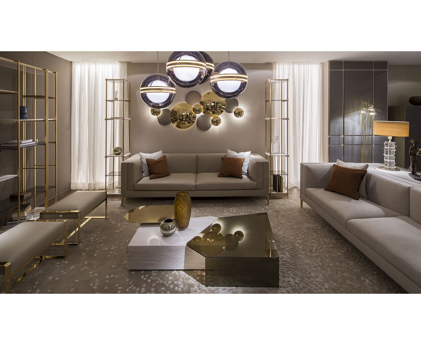 IMPERFECT SIDE - Журнальный столик, изготовленный из 3-х листов различных материалов - мрамор Rosa Egeo, сталь с гальванической отделкой золотым блеском, прозрачное стекло Avana - объединены и размещены блокированными.