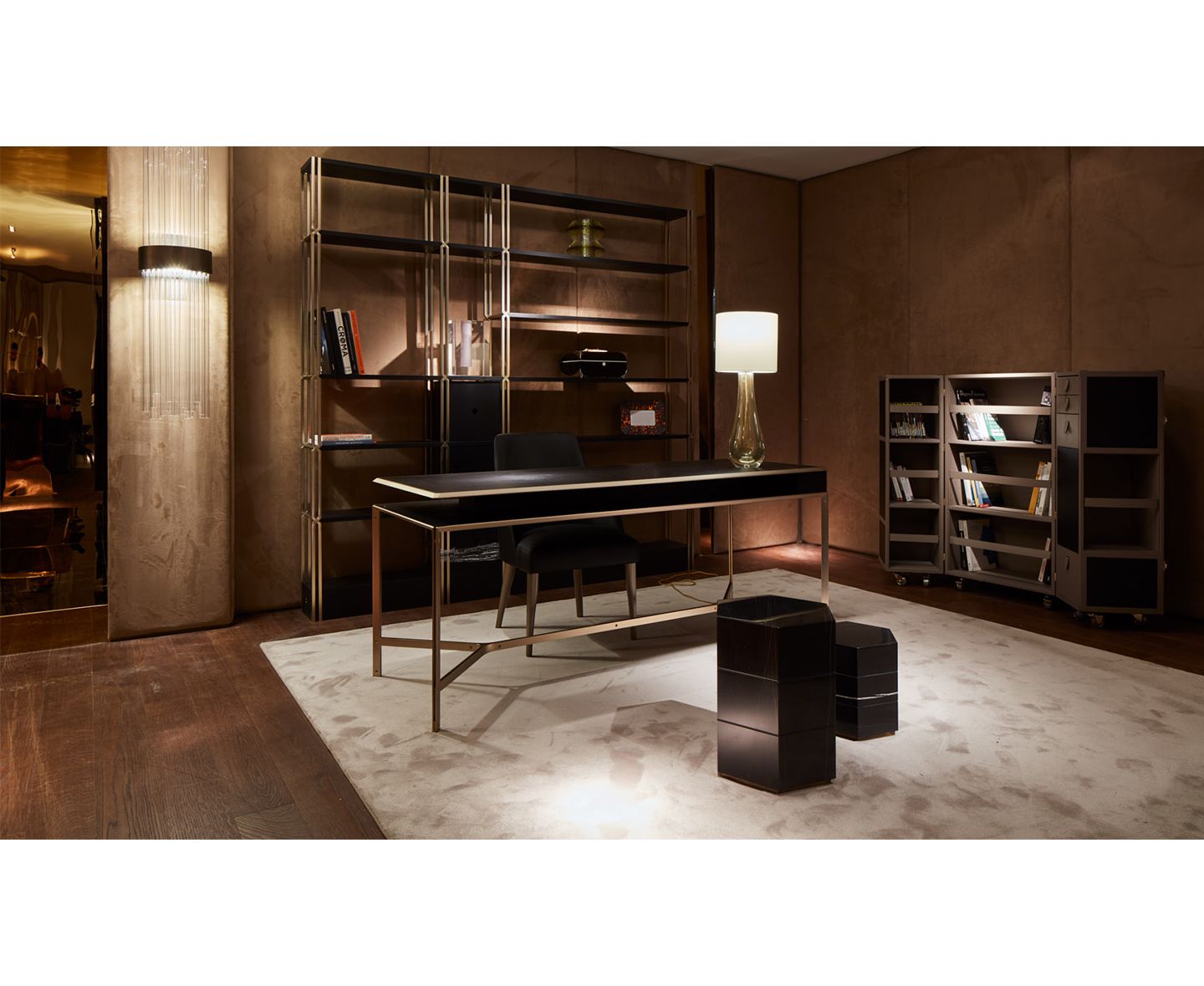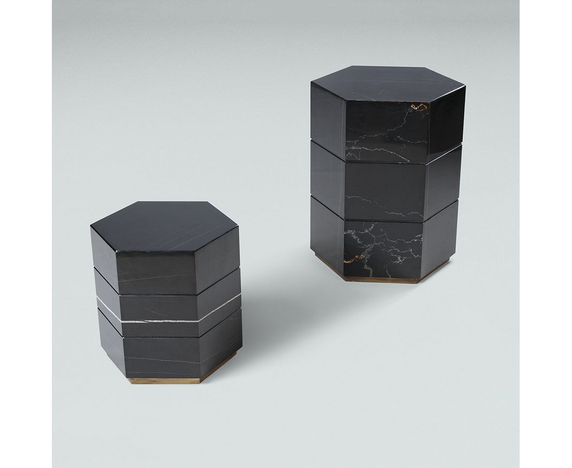 Монолитные геометрические элементы в шестиугольной форме, разной высоты из мрамора, дерева или металла. Деревянная основа покрыта металлом, обогащенным матовой латунной бронзовой отделкой. Мраморная модель выполнена из цельного мрамора Сахары.