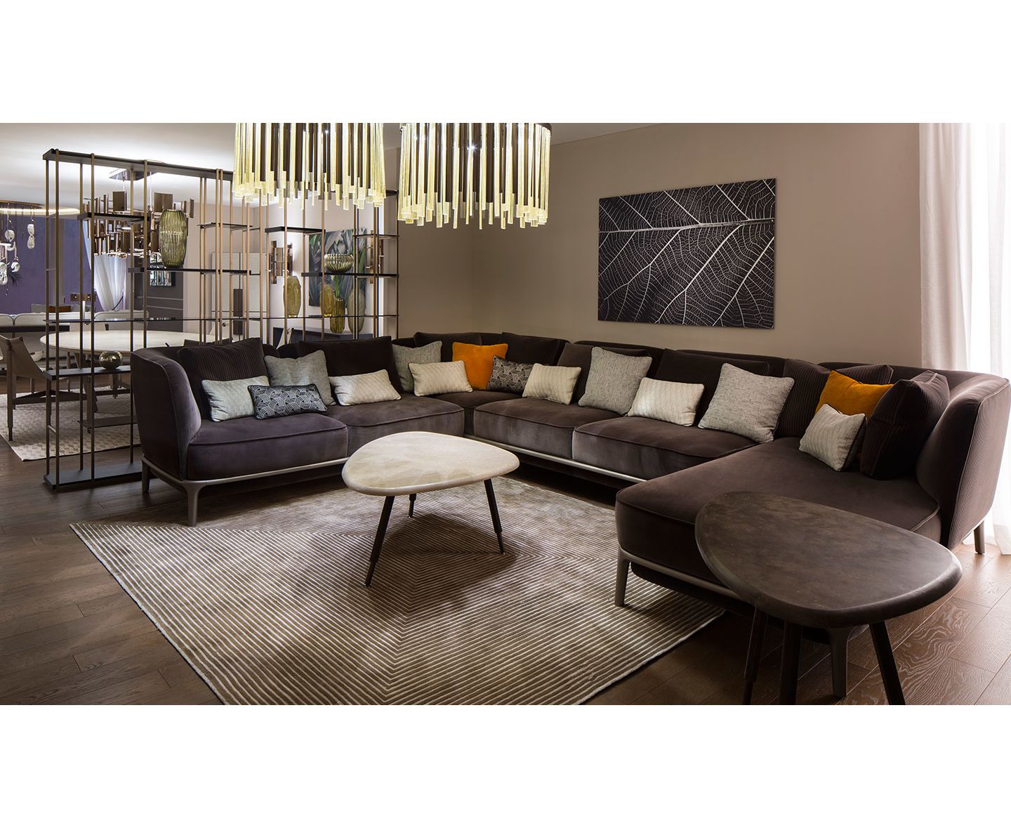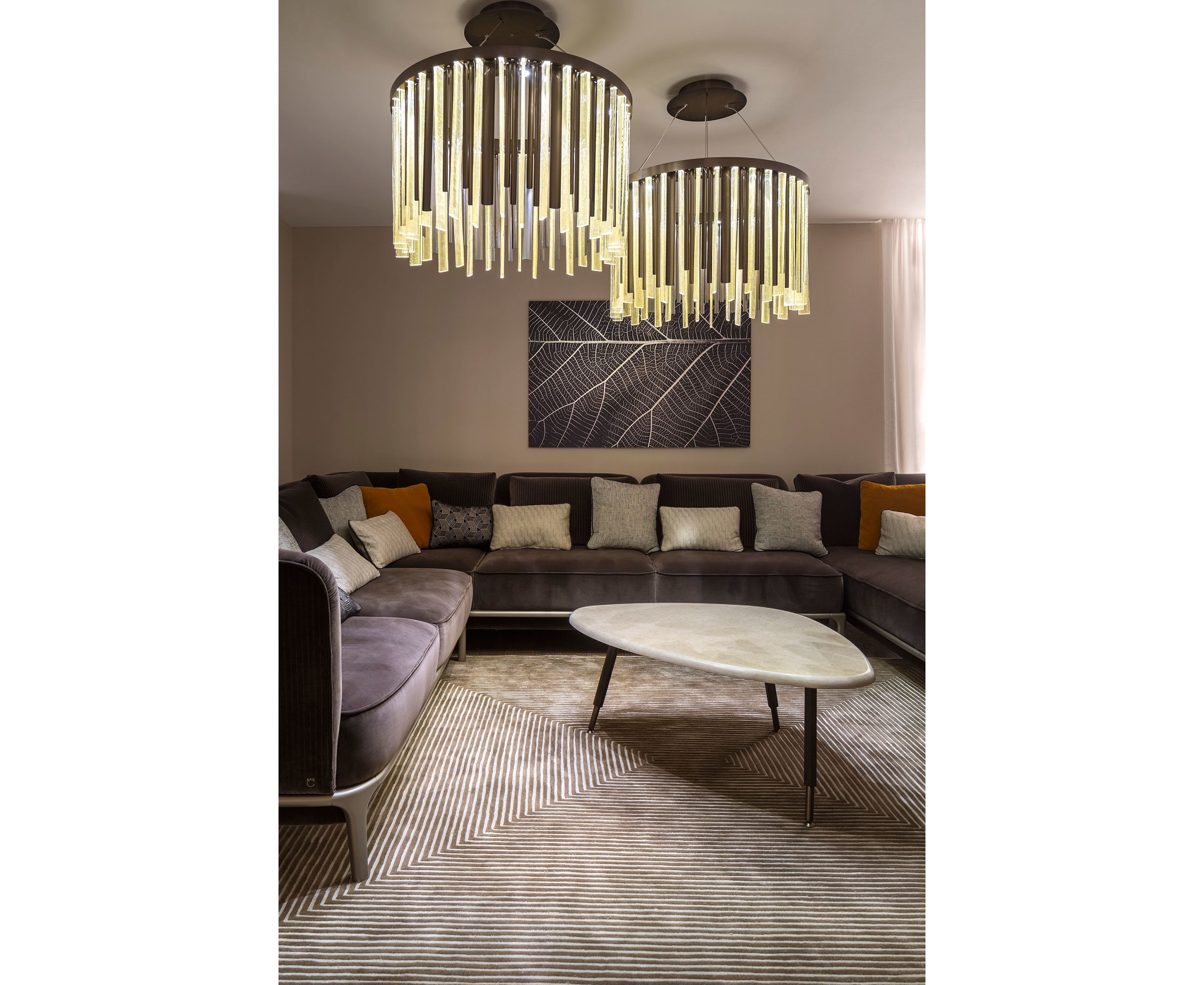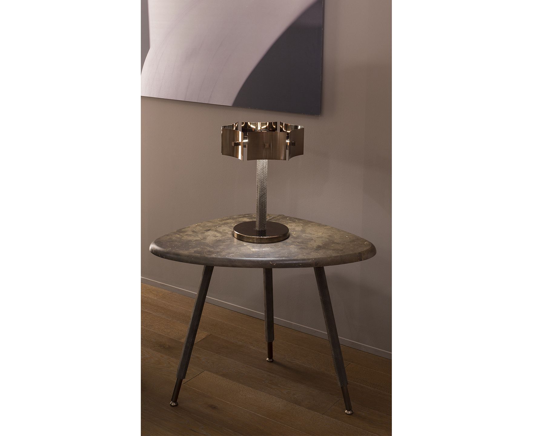 Журнальные столики для гостиной, сделанные из смолы (версия 90) и Noto stone (версия 120) возвращаются к мягкой форме листьев. Они придают комнате элегантность и чистоту линий, играя на современных матчах. Металлический каркас с 3 ножками, бронзовый Shadow Mat, гальваническая отделка, покрытый нубуком с переплетенным рисунком, окрашенный в тот же цвет каменной поверхности.