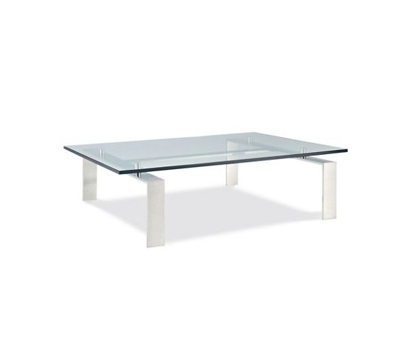 Квадратная стеклянная плита большого размера, кажется, плавает на полированной стальной основе с низкой Н-образной формой, в то время как стальные цилиндры удерживают стекло на высоте.
