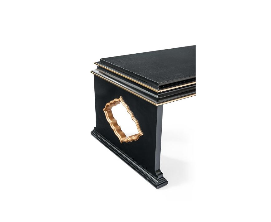 Более ранний прототип этого необычного коктейльного столика, вдохновленный греко-римскими стелами, можно найти в собственной квартире Алексы Хэмптон. Столешница отделана латунью, опускаясь до торцевых опор с пронзенными и позолоченными мавританскими отверстиями. Ступенчатые цокольные основания. Текстурированная лента из красного дерева.
