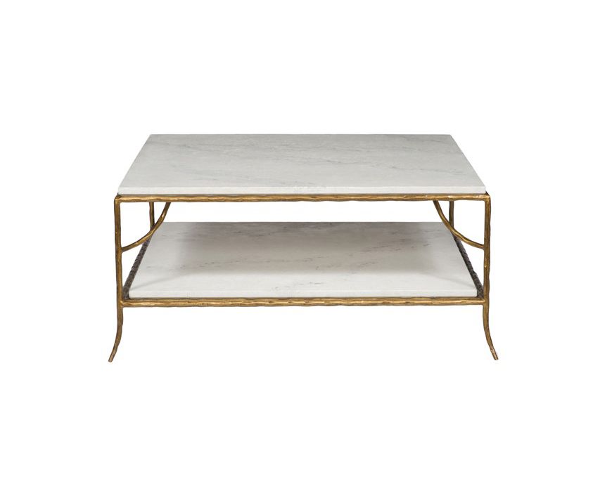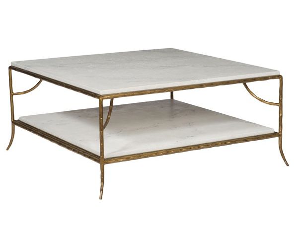Первые английские столы, разработанные специально для подачи кофе, были созданы в Великобритании в конце викторианской эпохи. Эти столы не являются низкими столами, их размеры составляют около 69 см. Изменение моды середины 20-го века отвечает за форму, которую мы знаем сегодня, от примерно 25 до 48 см в высоту. Коктейльный стол Тесса - это расширение семьи приставного стола Clio. У стола есть белоснежная каменная столешница из скальолы над текстурированной, латунной отделкой основания, состоящей из четырех вырезанных и расклешенных ножек, соединенных подрамниками, подвешивающими нижнюю полку из скальолы.
