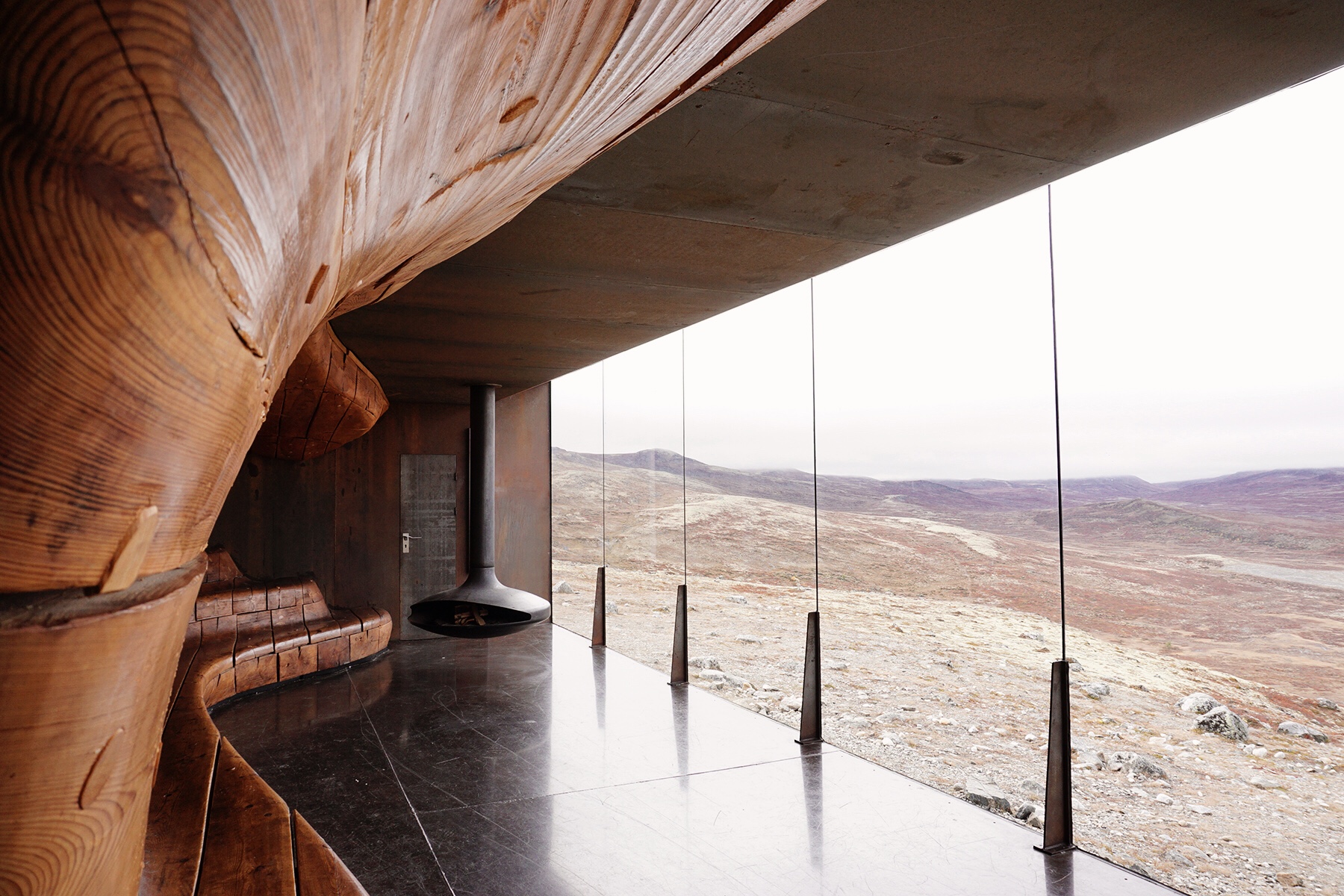 Современный подвесной камин также демонстрируется, не только добавляясь к форме здания, но и его функции. Проходящим посетителям предлагается разжечь огонь и согреться, наслаждаясь потрясающими панорамными видами через панорамные окна от пола до потолка.