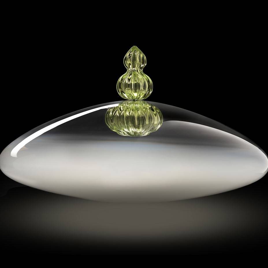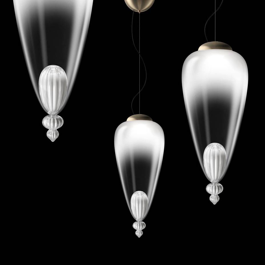 Лампа полностью изготовлена из венецианского хрусталя, выдувается и формируется вручную мастерами-стеклодувами, и состоит из трех частей: внешнего рассеивателя, выполненного в технике затененного энкальмо, заключенного в него “фрукта” с драгоценным ребристым эффектом и элемента, который завершает композицию, вызывая венецианские оттенки. Внешний плафон имеет очень чистый дизайн, выполненный одним выдуванием, и постепенно окрашивается в белый или серый цвет, созданный умелым жестом мастера. Другие детали, тонко обработанные в типичной технике ребристости из муранского стекла, имеют сложные, утонченные формы, поперечное сечение которых напоминает красивые лепестки раскрытого цветка лотоса. Для этих функций была выбрана очень живая и разнообразная хроматическая палитра, берущая свое начало – опять же в данном случае – от цветка и символики его цветов: он меняется от белого до цитрусового, аквамаринового, розового, в общей сложности 7 различных версий.