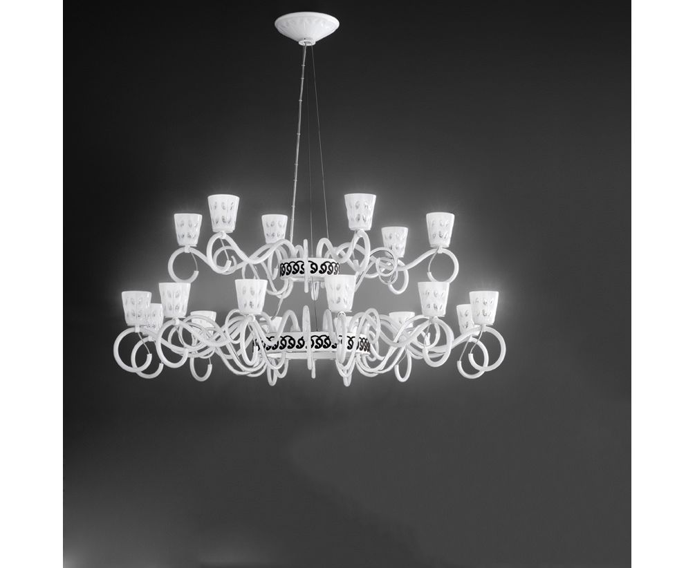 Люстра с витиеватым дизайном подойдет для любого помещения и интерьера. Лампы раскрылись на тонких и элегантных завитках, озаряя помещение мягким приятным светом, благодаря стеклянным рассеивателям молочно-белого цвета. Люстра украсит помещение в современном стиле, а также подойдет для стилизованного интерьера.