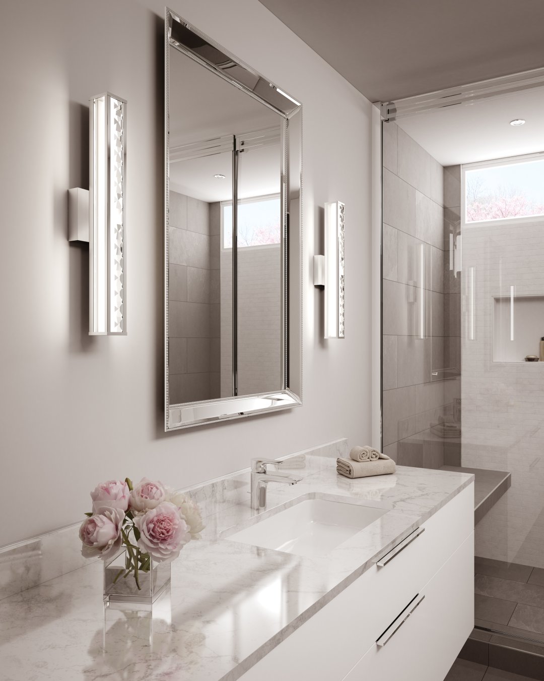 В дополнение к другим областям в ванне, которые должны иметь освещение - например, душ или парная, - здесь есть возможность добавить блеск либо из роскошного потолочного светильника, либо с помощью туалетного столика. Если вы можете позволить себе только одно или другое, освещение туалетного столика является самым важным, поскольку это место, где мы производим ежедневные процедуры.