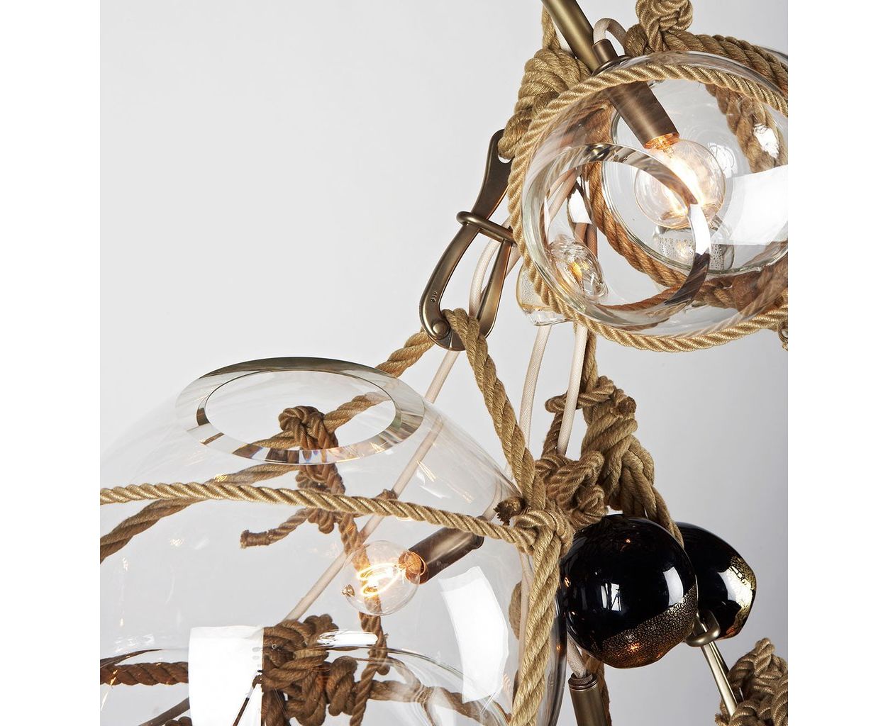 Вдохновленный японской упаковкой, буями и шибари, Knotty Bubbles - это скульптурный светильник, изготовленный из «пузырей», выдуваемых из стекла ручной работы, связанных веревкой.