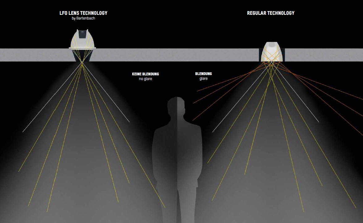 LFO LENS TECHNOLOGY привносит свет в комнату особым образом. С помощью новейшей технологии линз марки Bartenbach видимый свет уменьшается до абсолютного минимума 10 мм. Это означает, что технология светильника исчезает в потолке, не видно ни линзы, ни светодиодного питания. Свет фокусируется специальной линзой LFO на выходном отверстии настолько точно, насколько это возможно физически, и затем луч света снова расширяется до 30 ° и 55 ° соответственно. Таким образом, лампы освещают комнату обычным способом. Линзы LFO также обеспечивают впечатляющий контроль бликов, значительно улучшая визуальный комфорт.