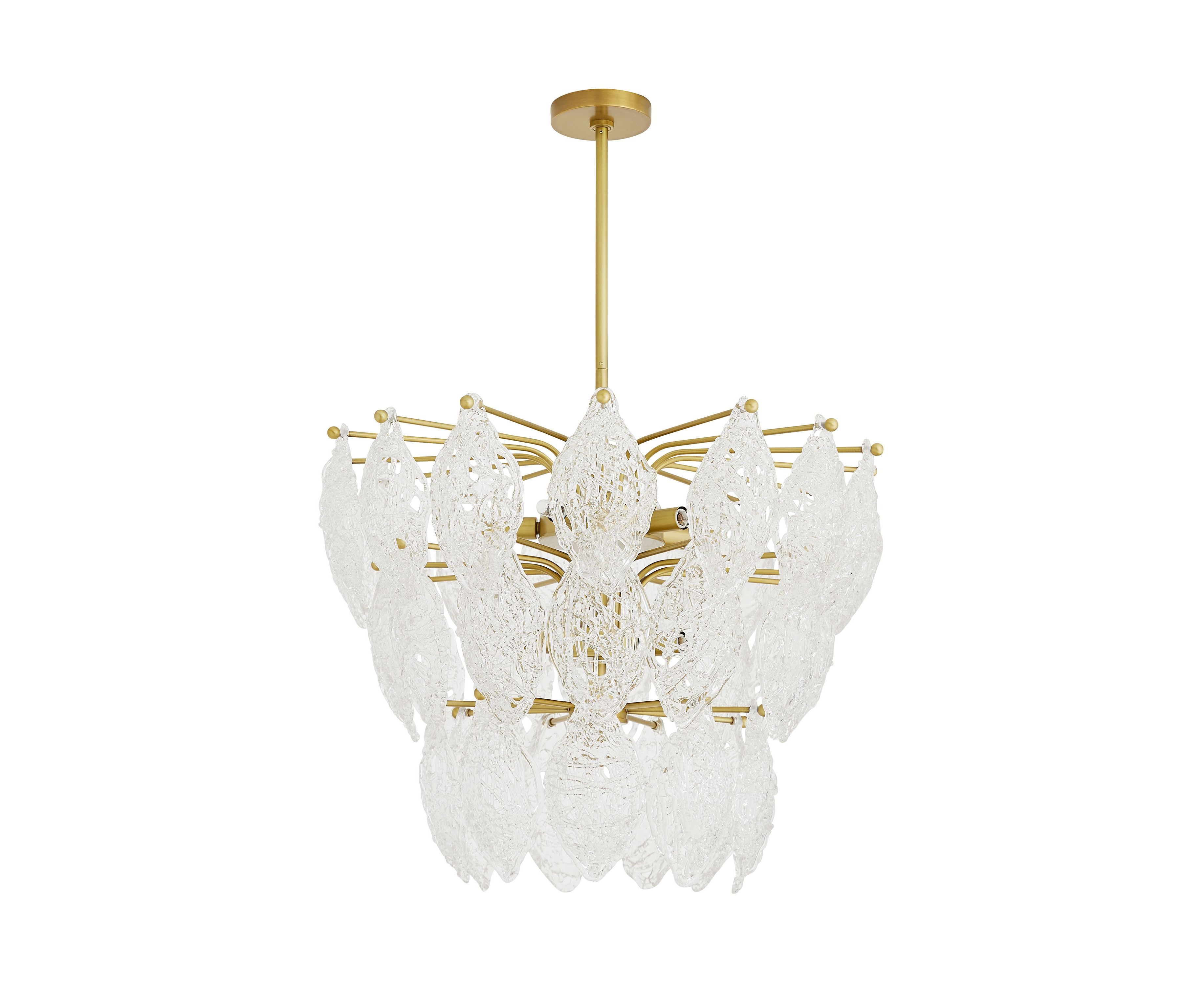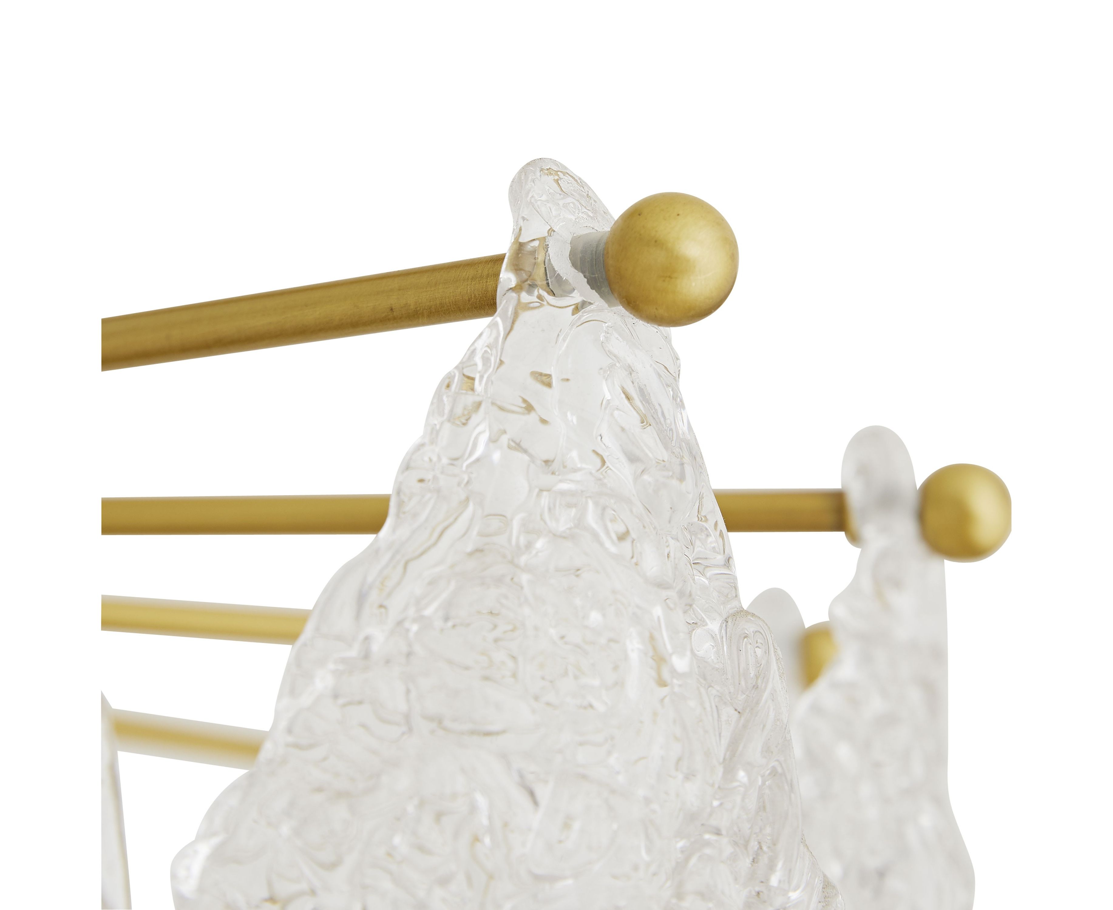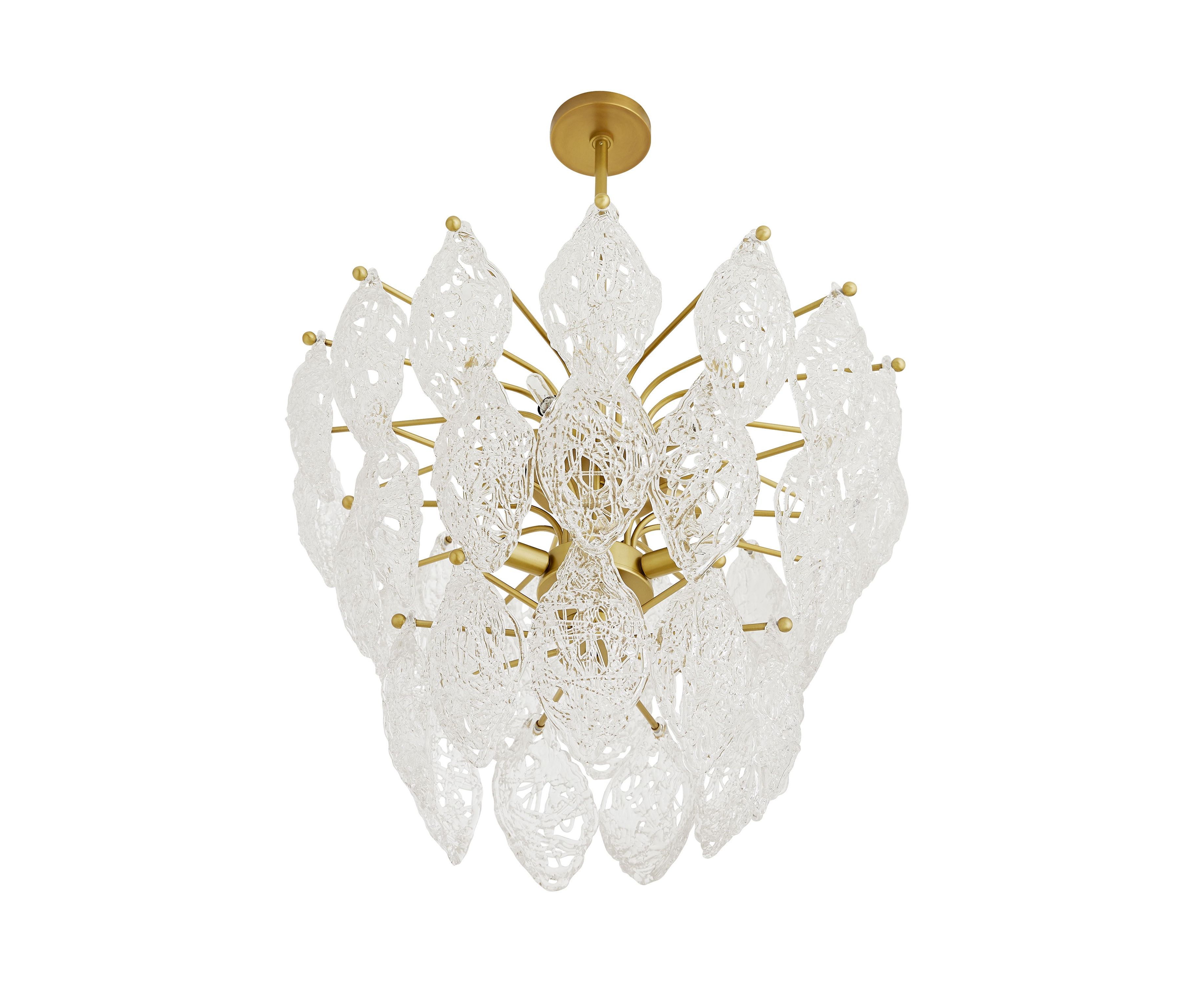Кустарный шедевр, в своем классе. Опытные стеклодувы разбросали кусочки прозрачного материала в форме, чтобы создать стеклянные каплевидные образования-спагетти, которые определяют эту люстру из восьми ламп. Старинный латунный каркас демонстрирует три нисходящих яруса, создавая его классический, хотя и далеко не обычный, силуэт водопада. Отделка и стекло могут отличаться.