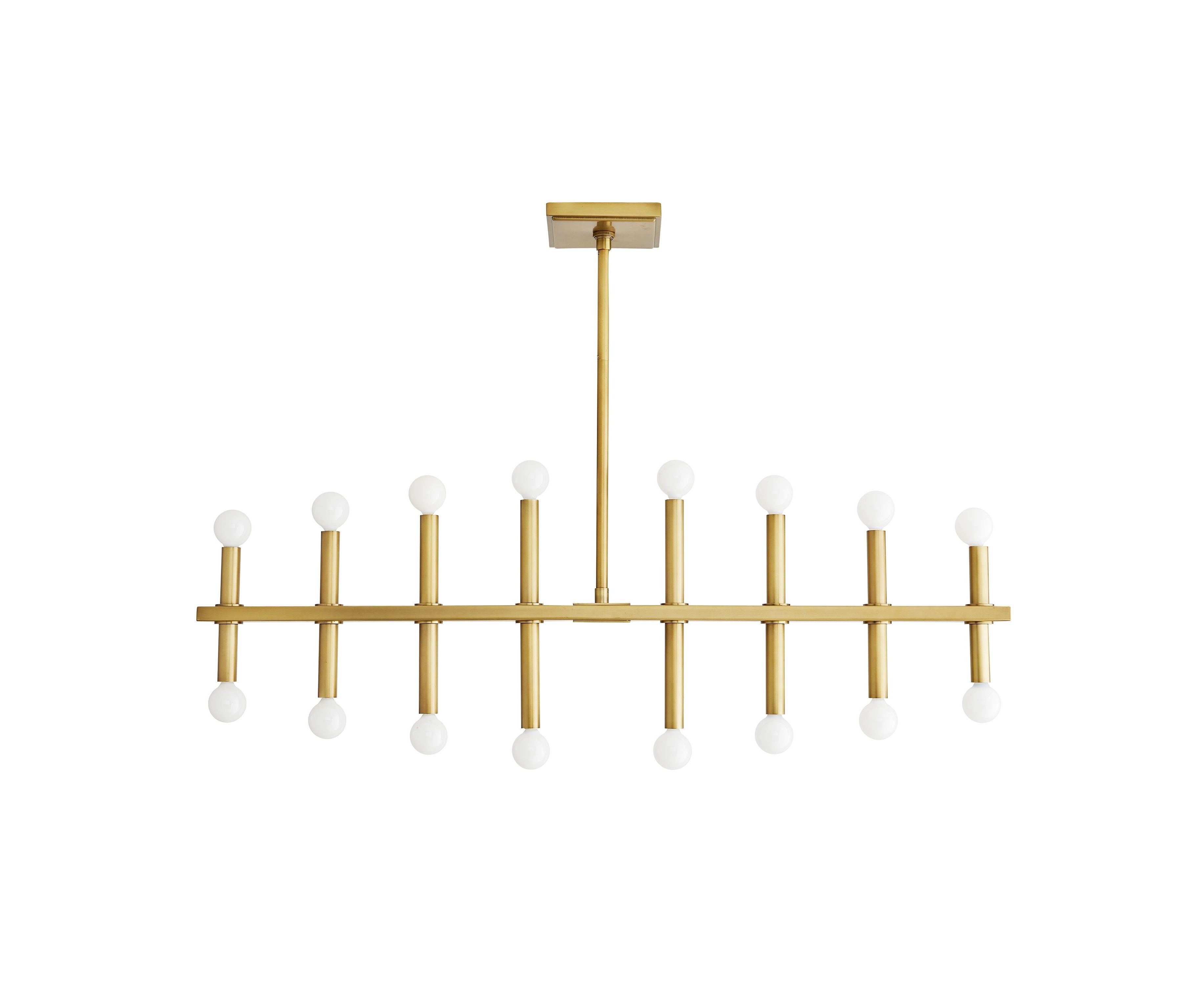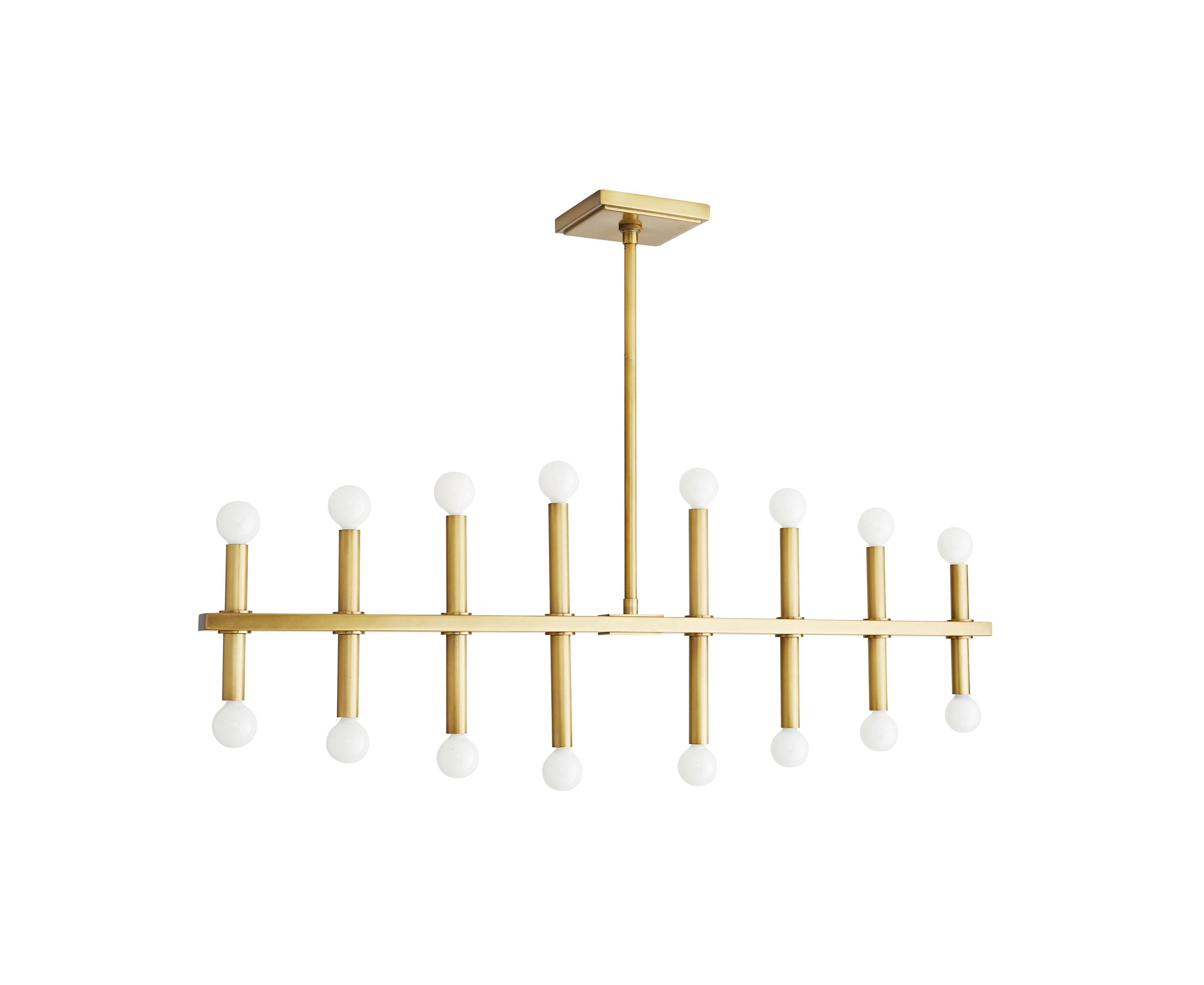 Стиль встречает структуру с этим современным взглядом на канделябры. Гладкая стальная линейная форма, выполненная из античной латуни, демонстрирует вертикальные трубы, которые увеличиваются, а затем уменьшаются в размерах от одного конца к другому. Каждый представляет две глобусные лампы с достаточным количеством света, чтобы осветить пространство, которое он занимает.