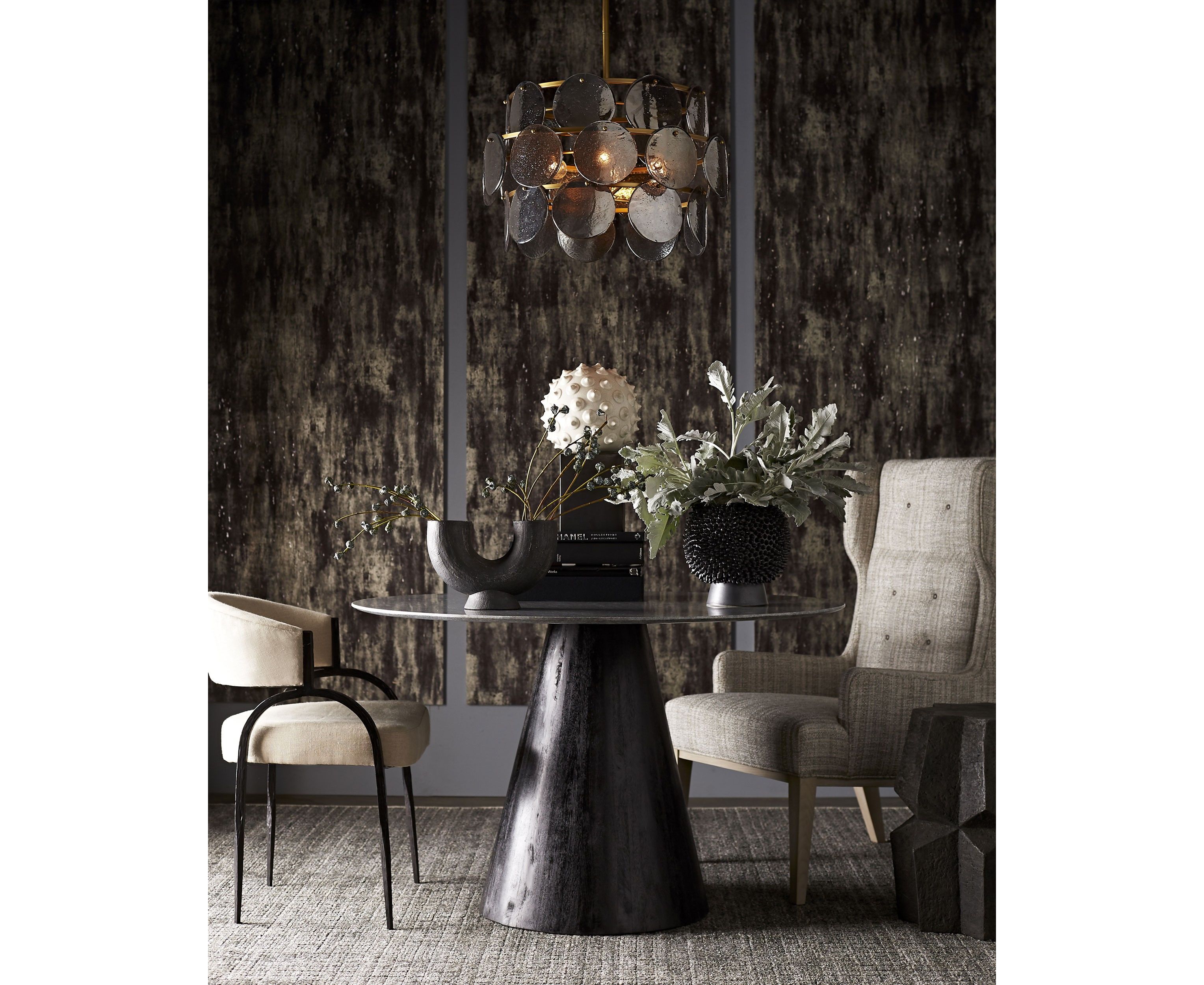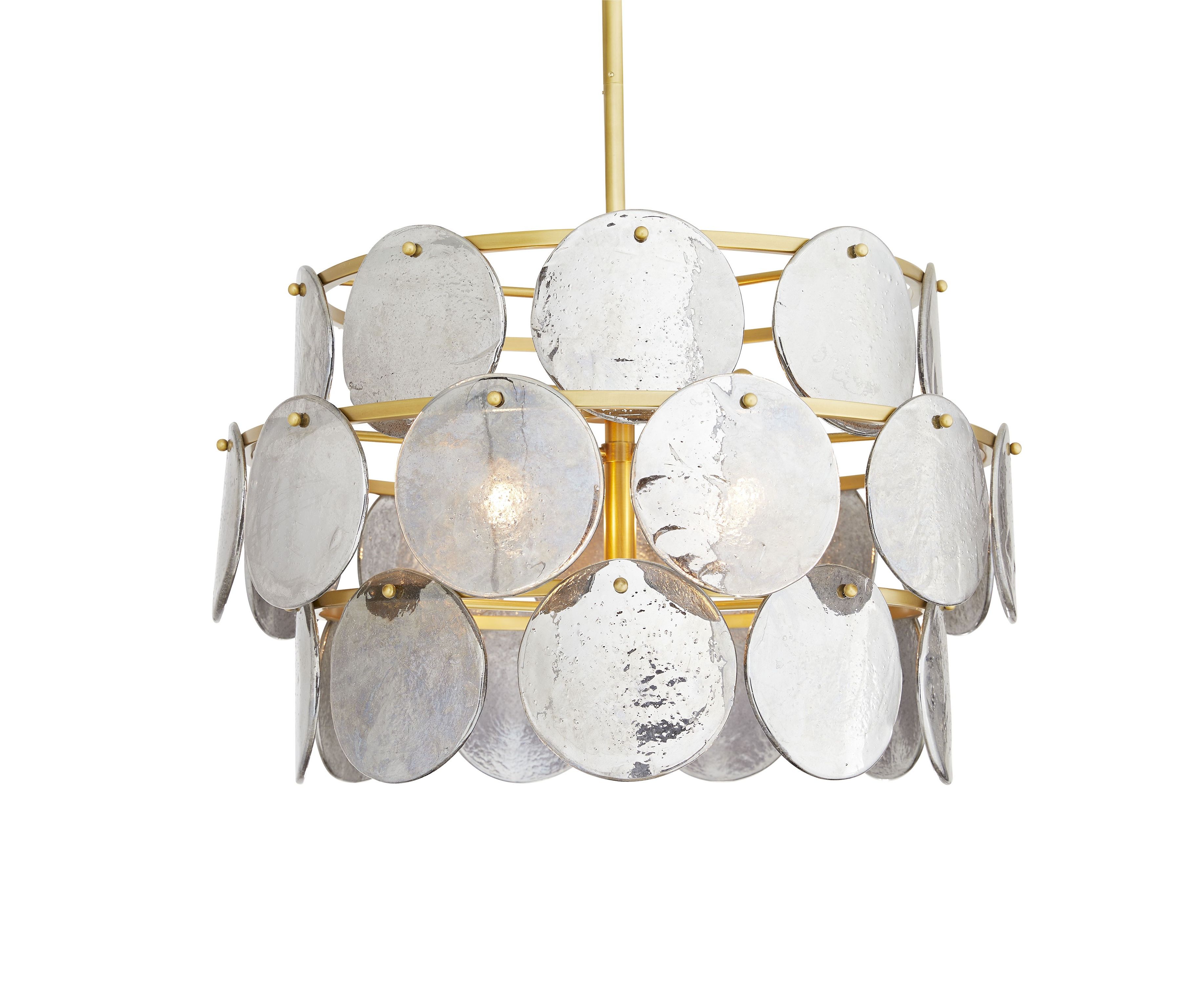 Большие круглые осевшие стеклянные панели с дымчатым покрытием крепятся к многоуровневой концентрической стальной раме из античной латуни, которая подвешена к соответствующей гладкой стальной трубе. При освещении свет придает мягкий оттенок капризному оттенку стекла, еще более усиливая его естественный состав. Идеально подходит для добавления небольшой драмы и много блеска в комнате. Отделка может отличаться.