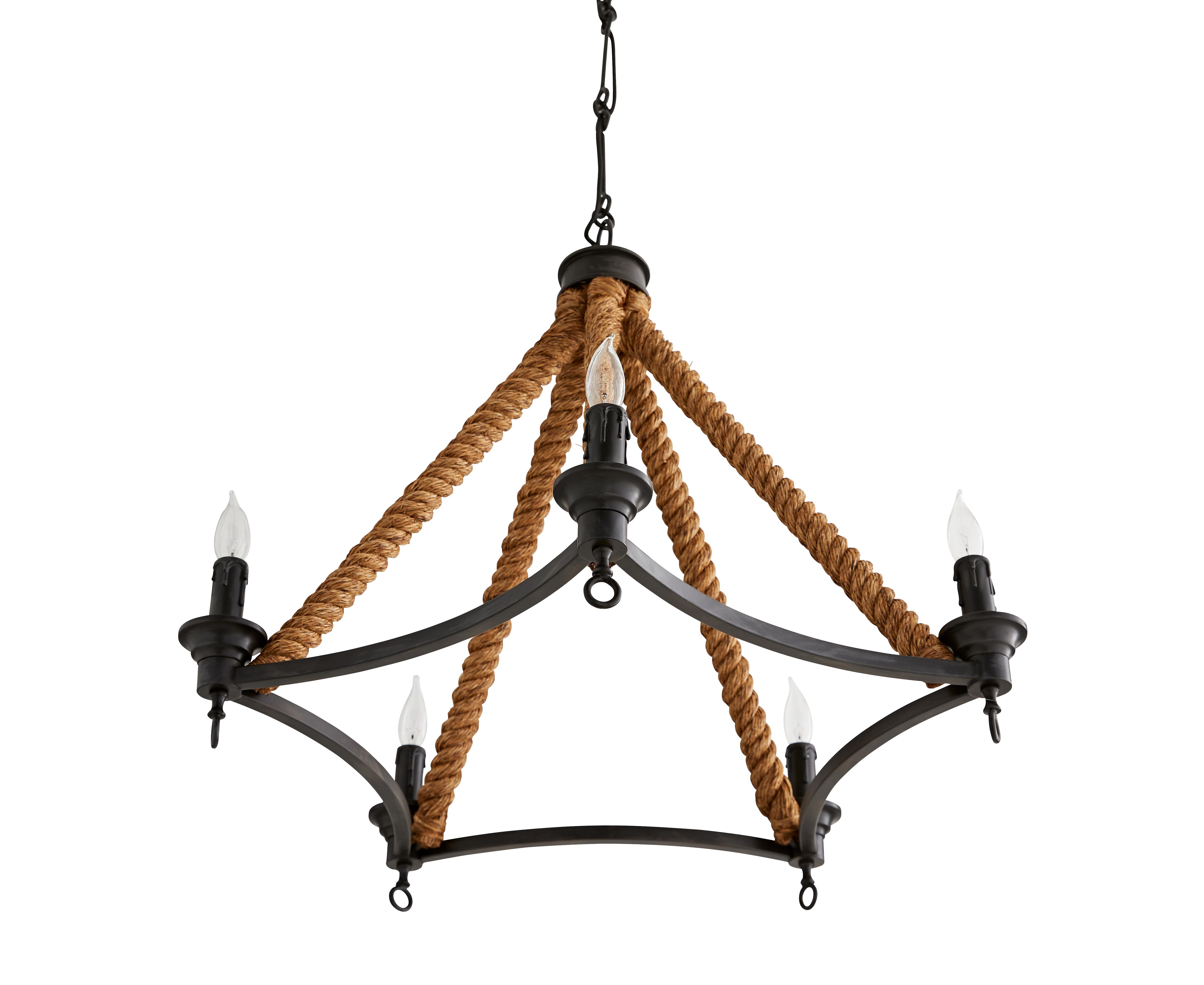 Талант старого света интригует чувства на этой пяти ламповой люстре, изготовленной с мастерством. Тонкое железное основание контрастирует с толстой натуральной веревкой, которая была соткана вручную вдоль рамы, с акцентом на декоративную капельницу, которая имитирует сгоревший воск свечи.