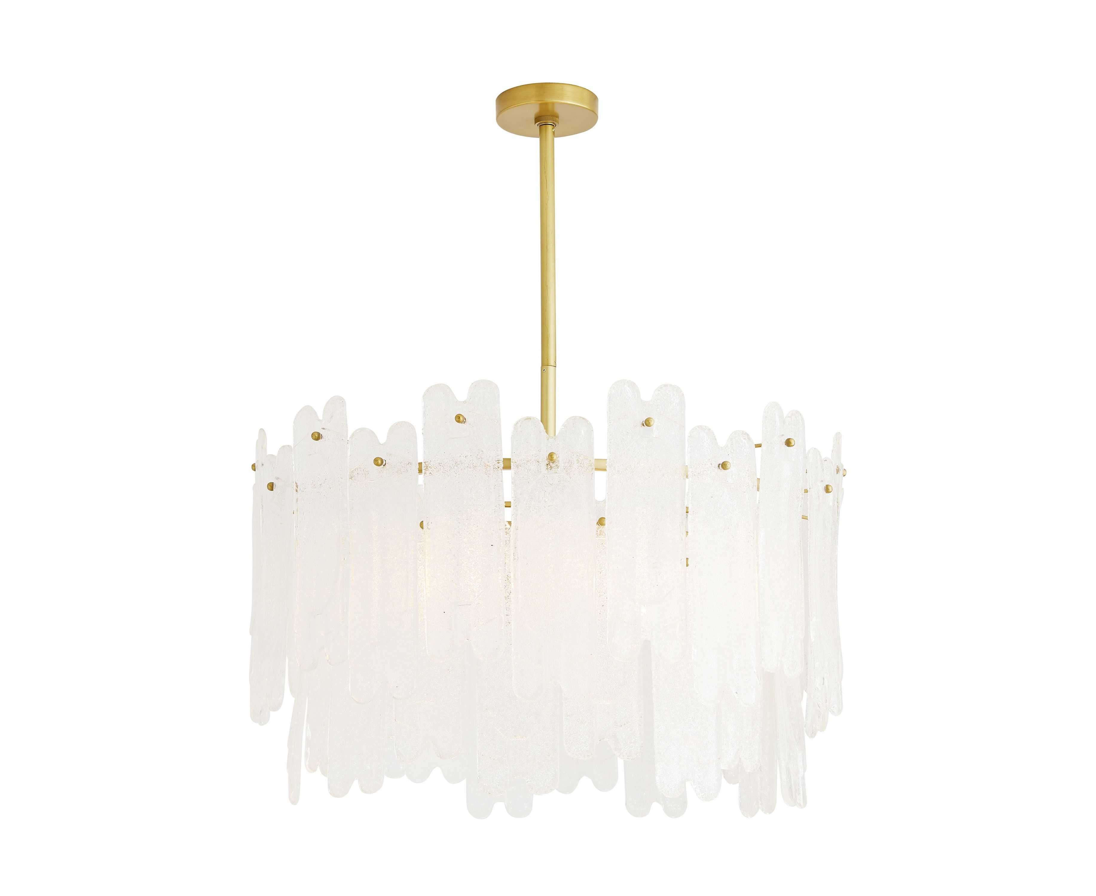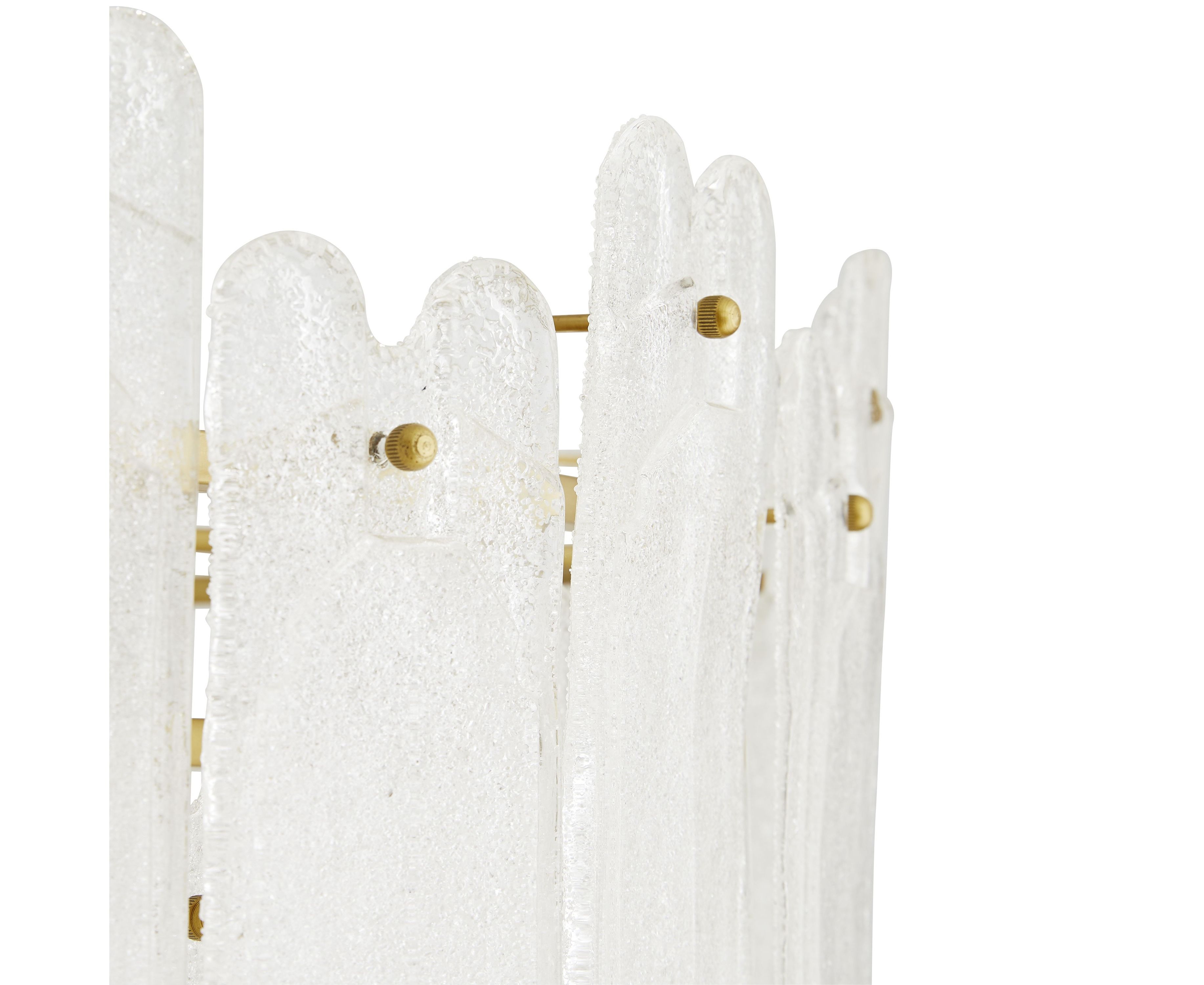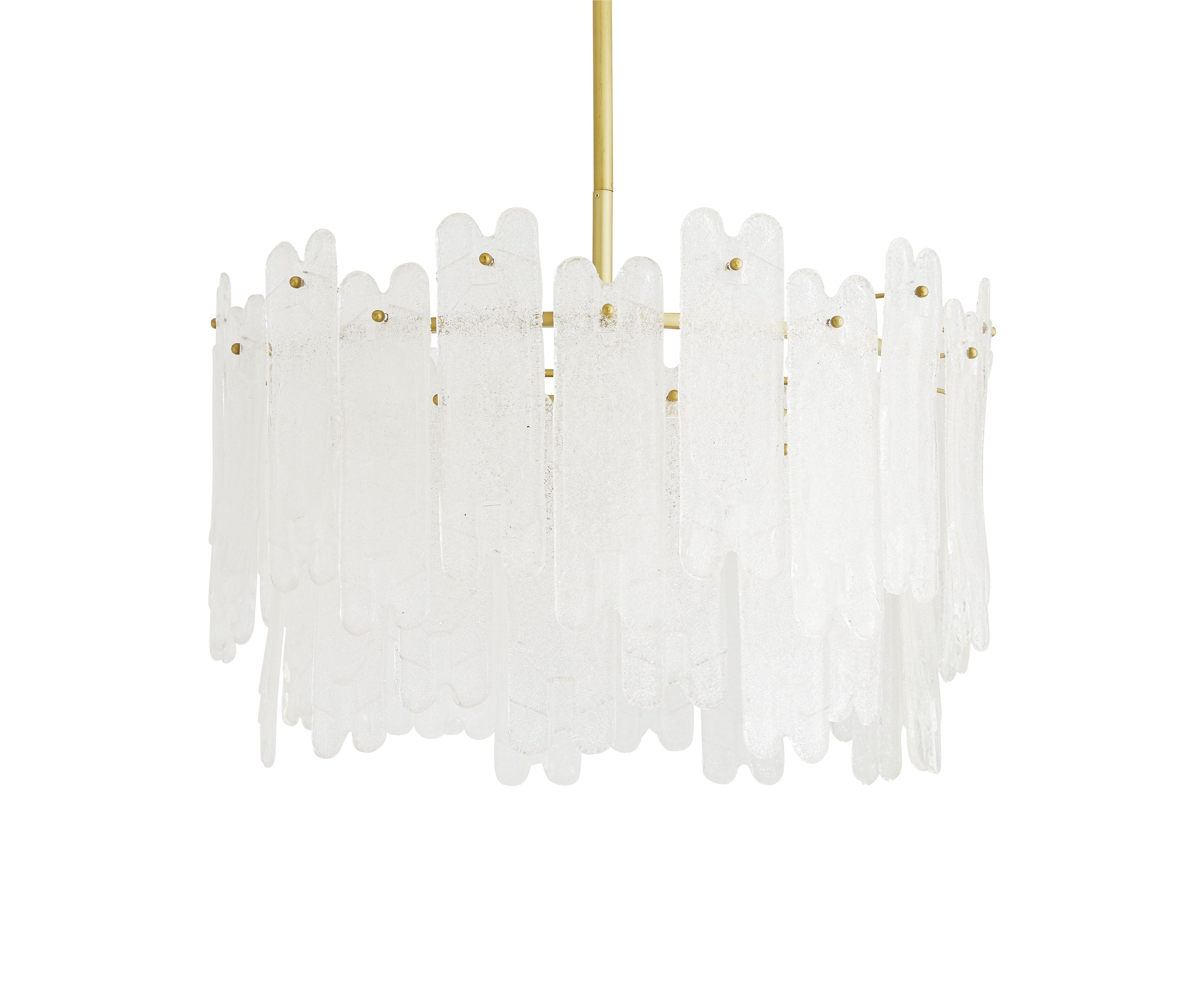 Напрозрачные стеклянные пластины образуют люстру Mugler. Античная латунная отделка стальной рамы задает стильный и изящный тон. Каждая уникальная стеклянная пластинка вытравлена в продолговатый восьмиугольник с различной отделкой, не оставляя двух одинаковых. Его многоярусные части кажутся почти таящими льдами, подвешенными во времени. Отделка может отличаться.