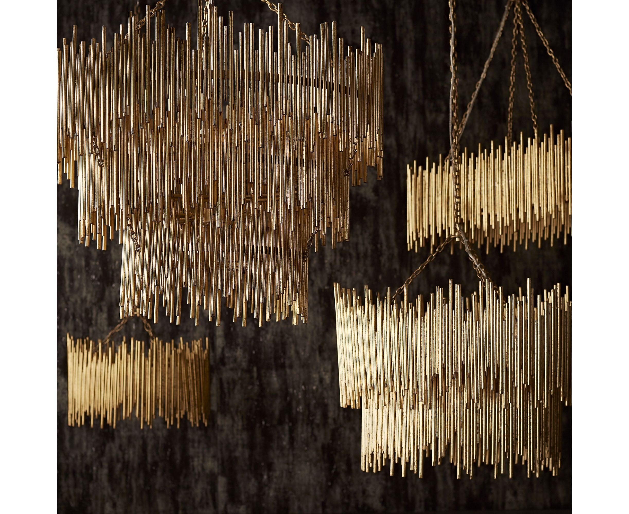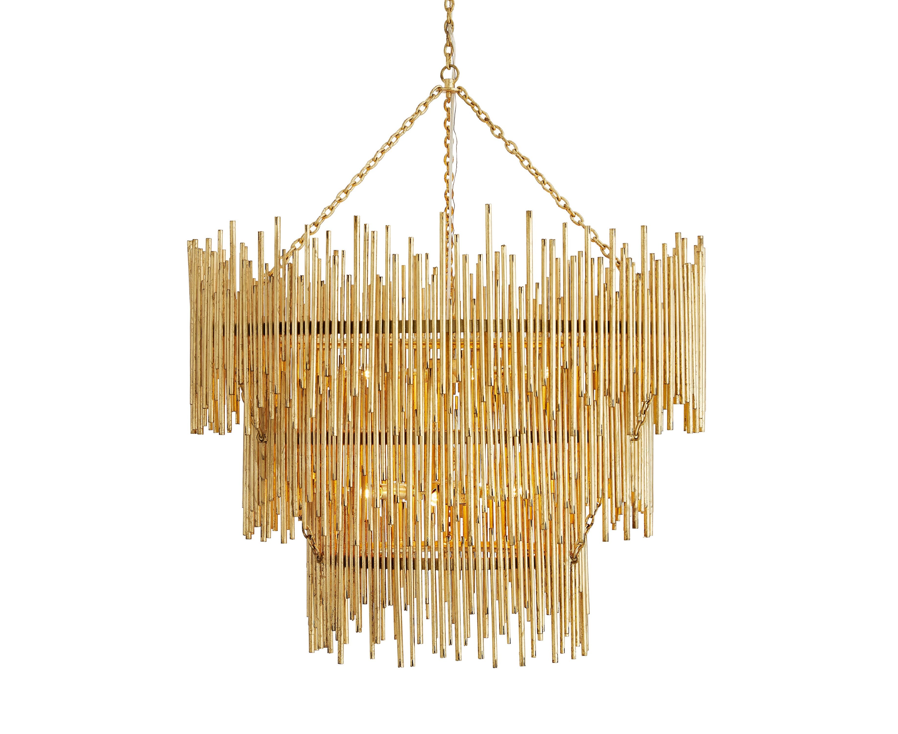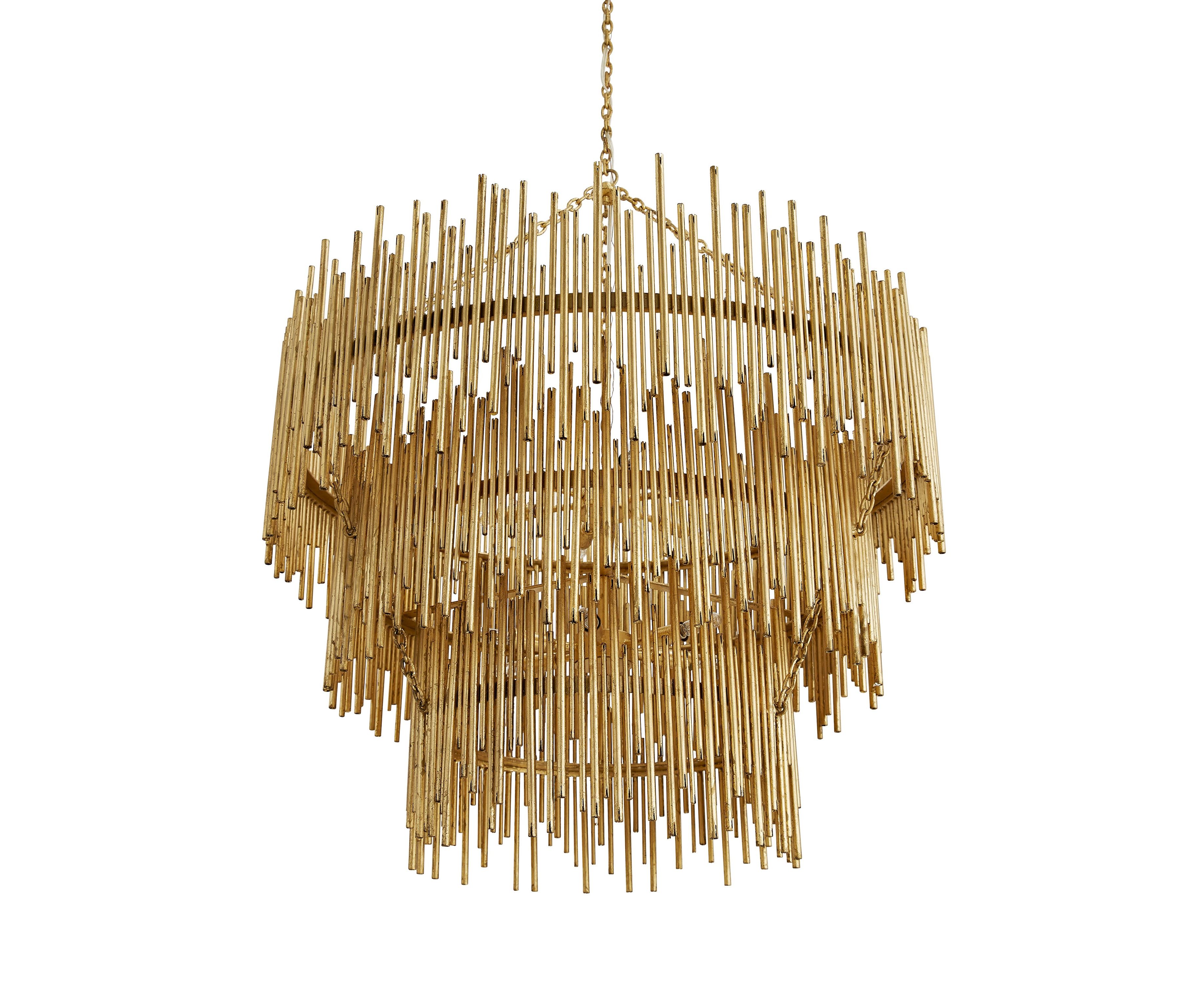 Отдельные железные прутки сварены вместе и обработаны вручную сусальным золотом для создания этой трехуровневой люстры. Весь светильник покрыт сусальным золотом, вплоть до потолочного крепления. Деревенский, но, несомненно, элегантный. Проливает так много света с 12 стандартными лампами. Отделка сусальным золотом может варьироваться.