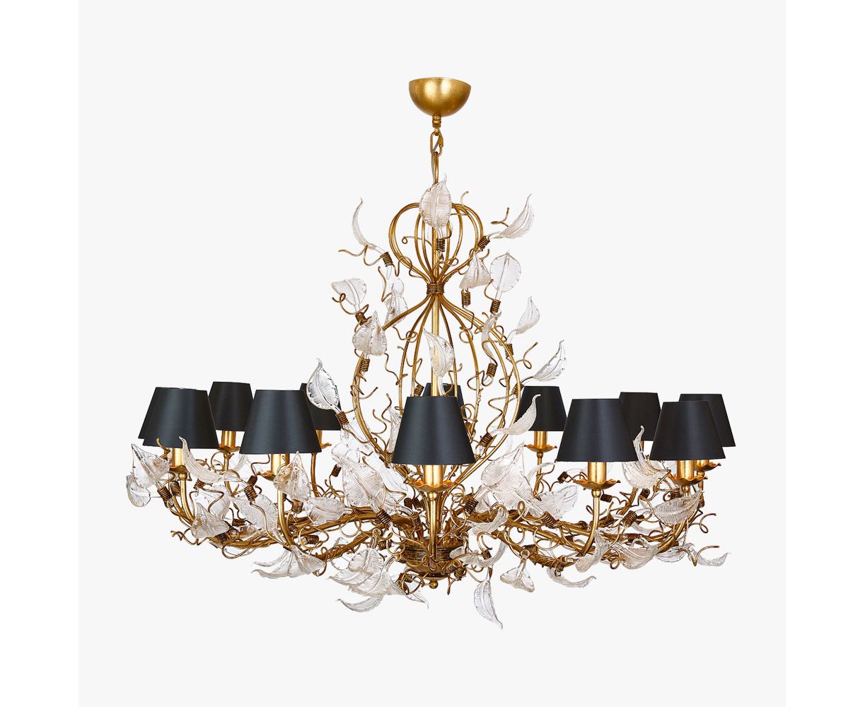 Очень элегантная и внушительная люстра с металлическим каркасом, которая красиво украшена современными листьями ручной работы из муранского стекла различных цветов.